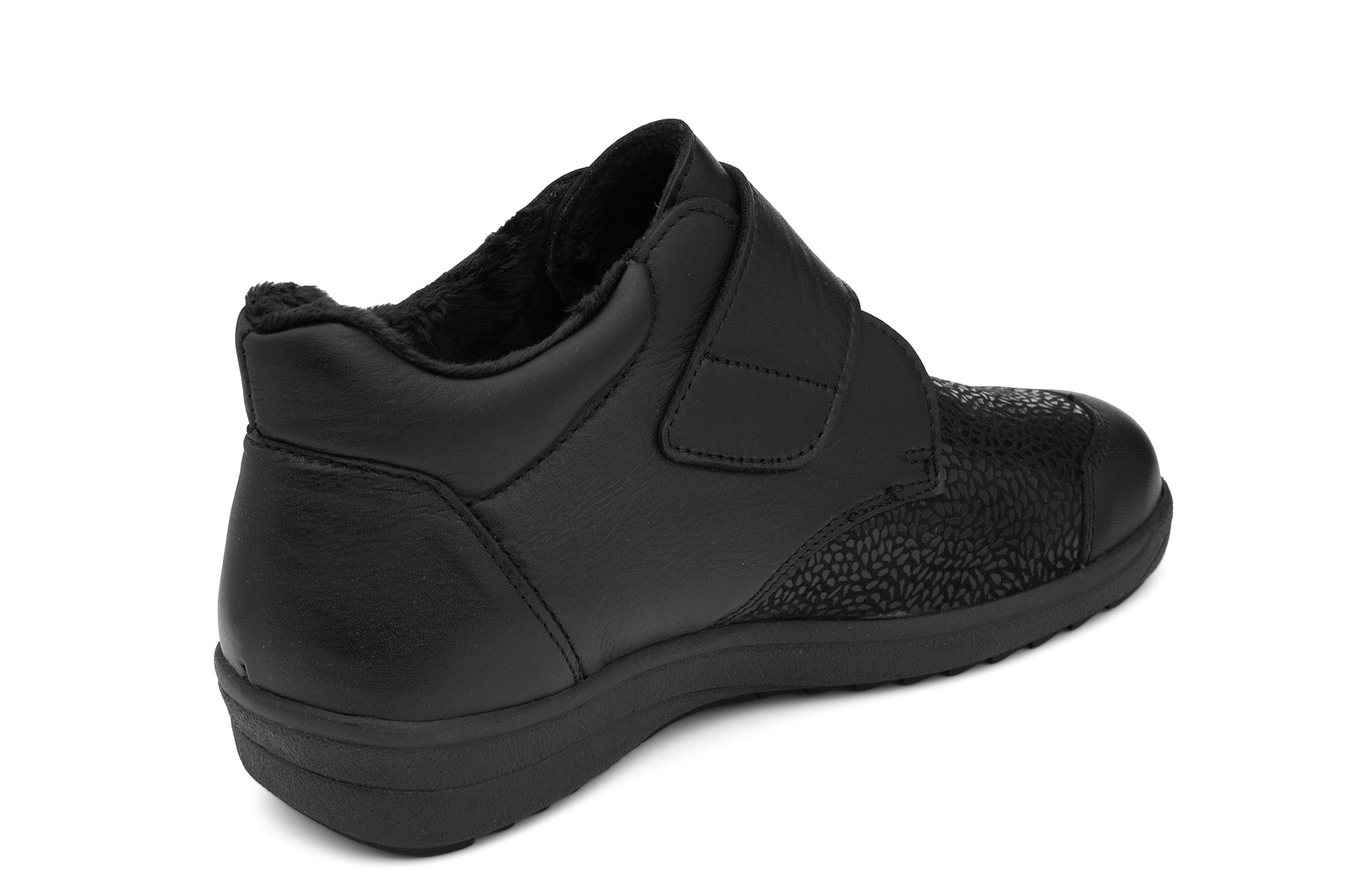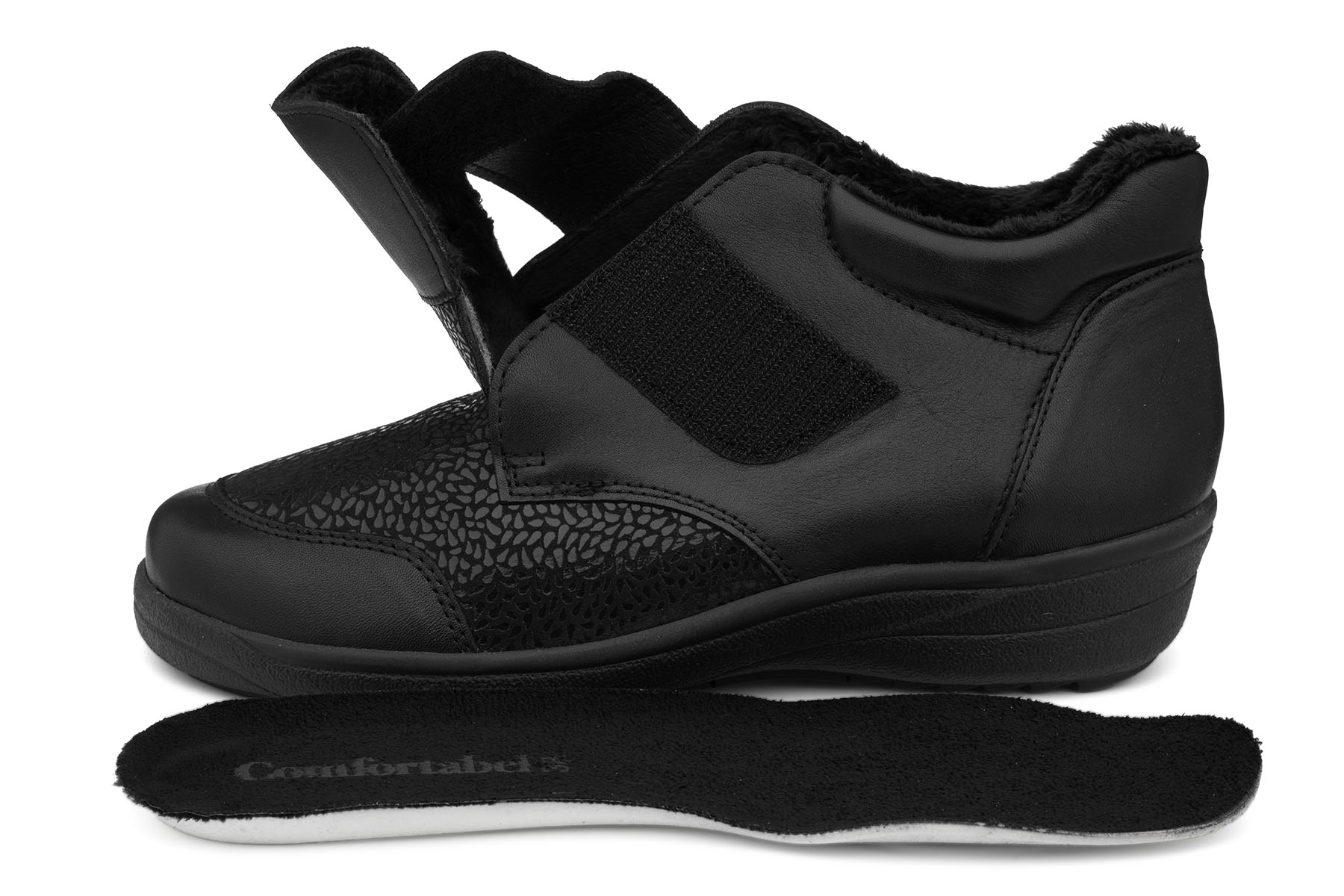 Comfortabel 990542 01 wygodne botki damskie wykonane ze skóry naturalnej - licowej w kolorze czarnym; z przodu elastyczny materiał ułatwiający dopasowanie obuwia do niedoskonałości stopy; regulowane paskiem na rzep; wyjmowane wkładki z przyjemnego mikroweluru; ocieplone futerkiem tekstylnym; elastyczne, antypoślizgowe podeszwy; tęgość K - polecane na stopy szerokie, na przykład z halluksami, stopy cukrzycowe.