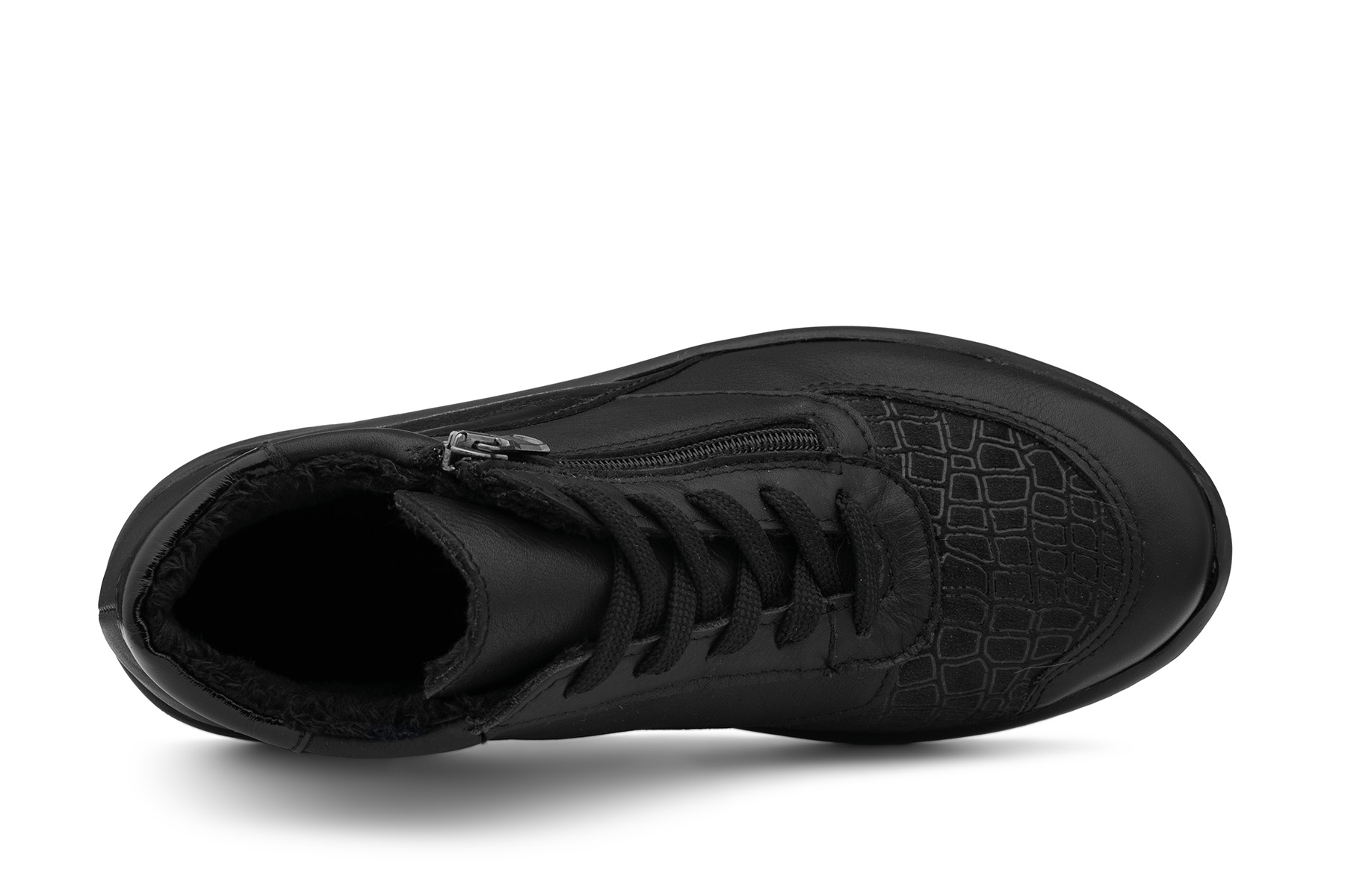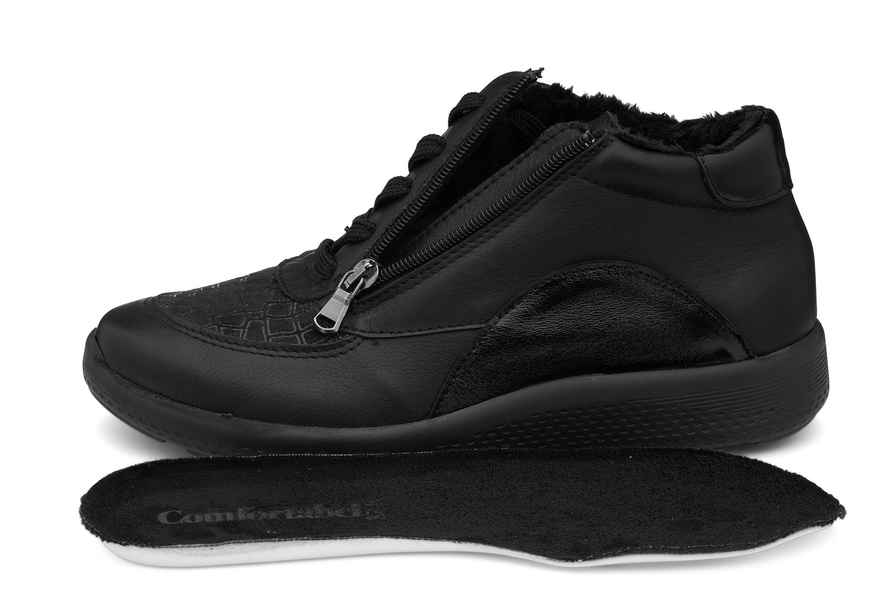Comfortabel 990723 01 wygodne botki damskie wykonane ze skóry naturalnej - licowej w kolorze czarnym; na podbiciu rozciągliwa tkanina ułatwiająca dopasowanie obuwia do niedoskonałości stopy; boczny suwak ułatwiający zakładanie; wyjmowane wkładki z przyjemnego mikroweluru; ocieplone futerkiem; lekkie, elastyczne antypoślizgowe podeszwy; tęgość K - polecane na stopy szerokie, na przykład z haluksami, stopy cukrzycowe.