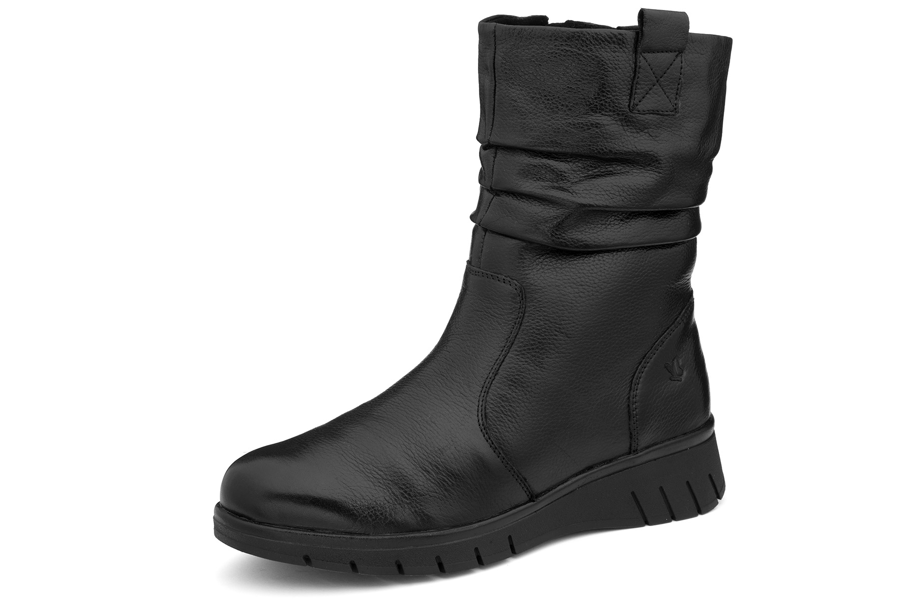 Caprice 9-26455-45 022 wygodne damskie botki wykonane z miękkiej skóry naturalnej - licowej; wyjmowane, ciepłe wełniane wkładki; elastyczne, antypoślizgowe podeszwy; ocieplone wełną; boczny suwak ułatwiający zakładanie; tęgość H - polecane na stopy szersze.