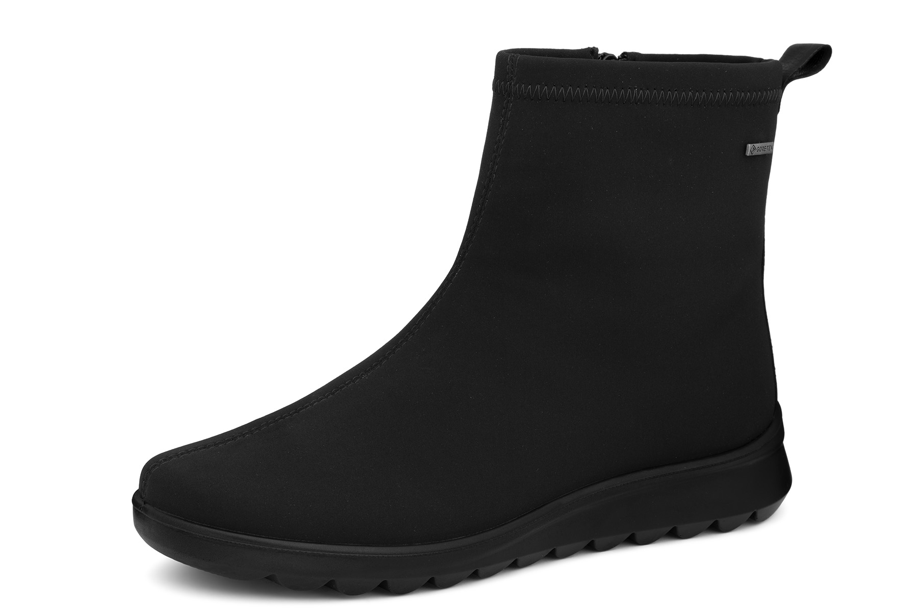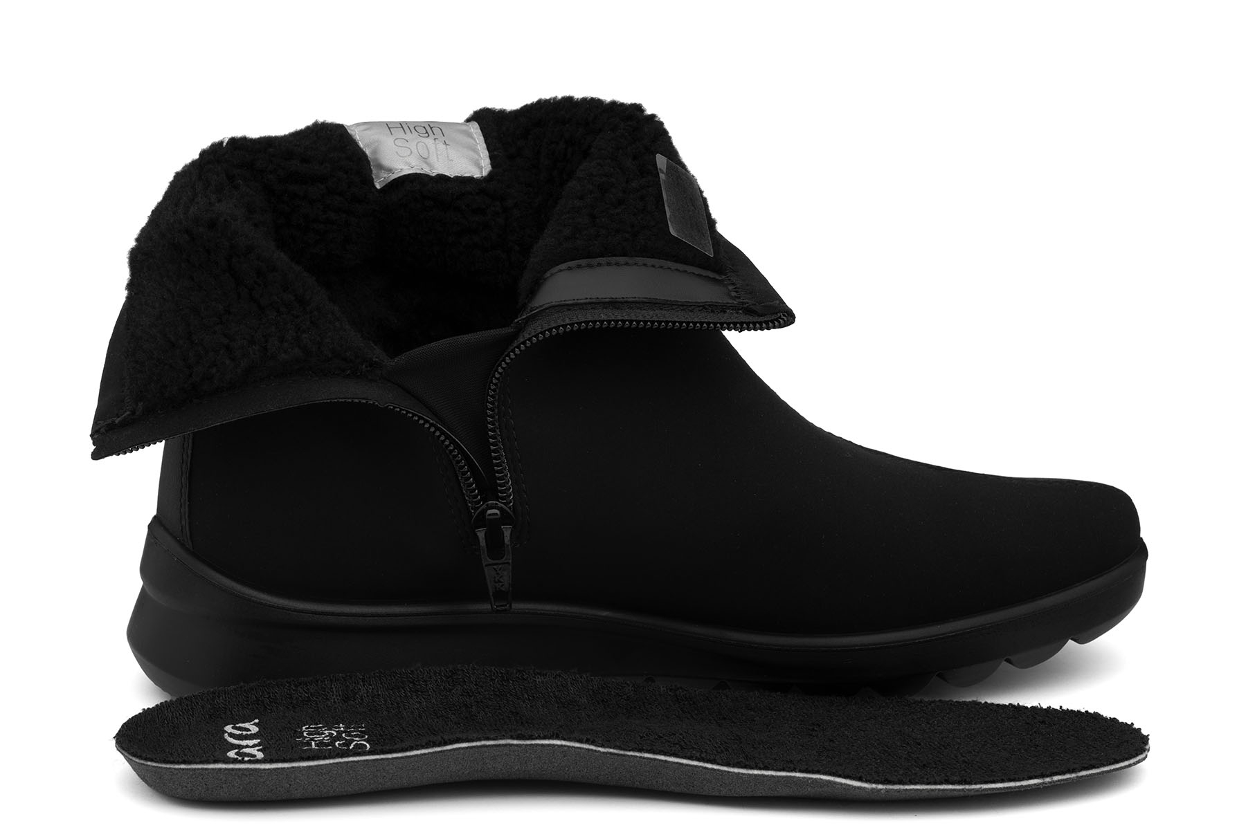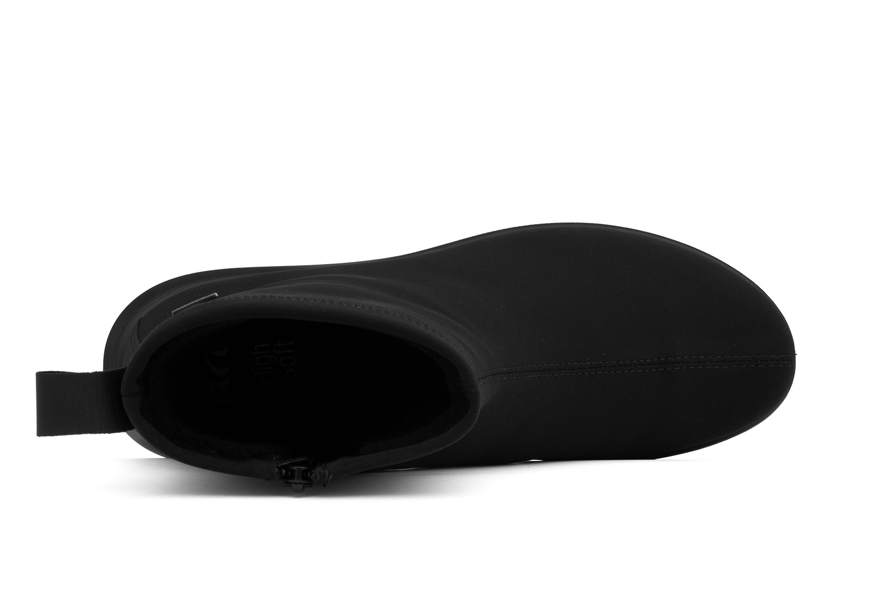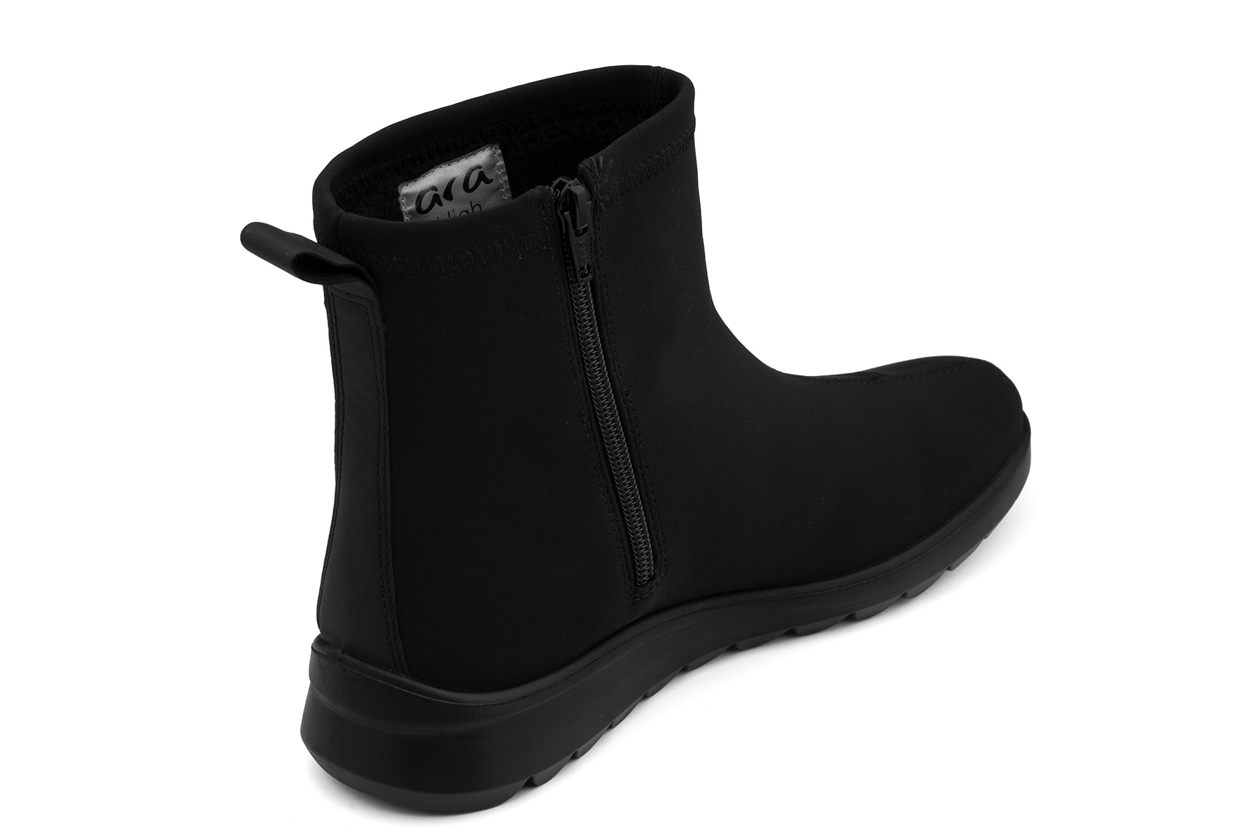 Ara Toronto 12 40412 01H High Soft wygodne botki damskie wykonane z materiału zabezpieczonego nieprzemakalną membraną Gore-Tex; wyjmowane, amortyzujące wkładki - HighSoft z pelotą na płaskostopie poprzeczne; lekkie, elastyczne, antypoślizgowe podeszwy; długi boczny suwak ułatwiający zakładanie; ocieplone tkaniną wełnianą; tęgość H - polecane na stopy szersze.