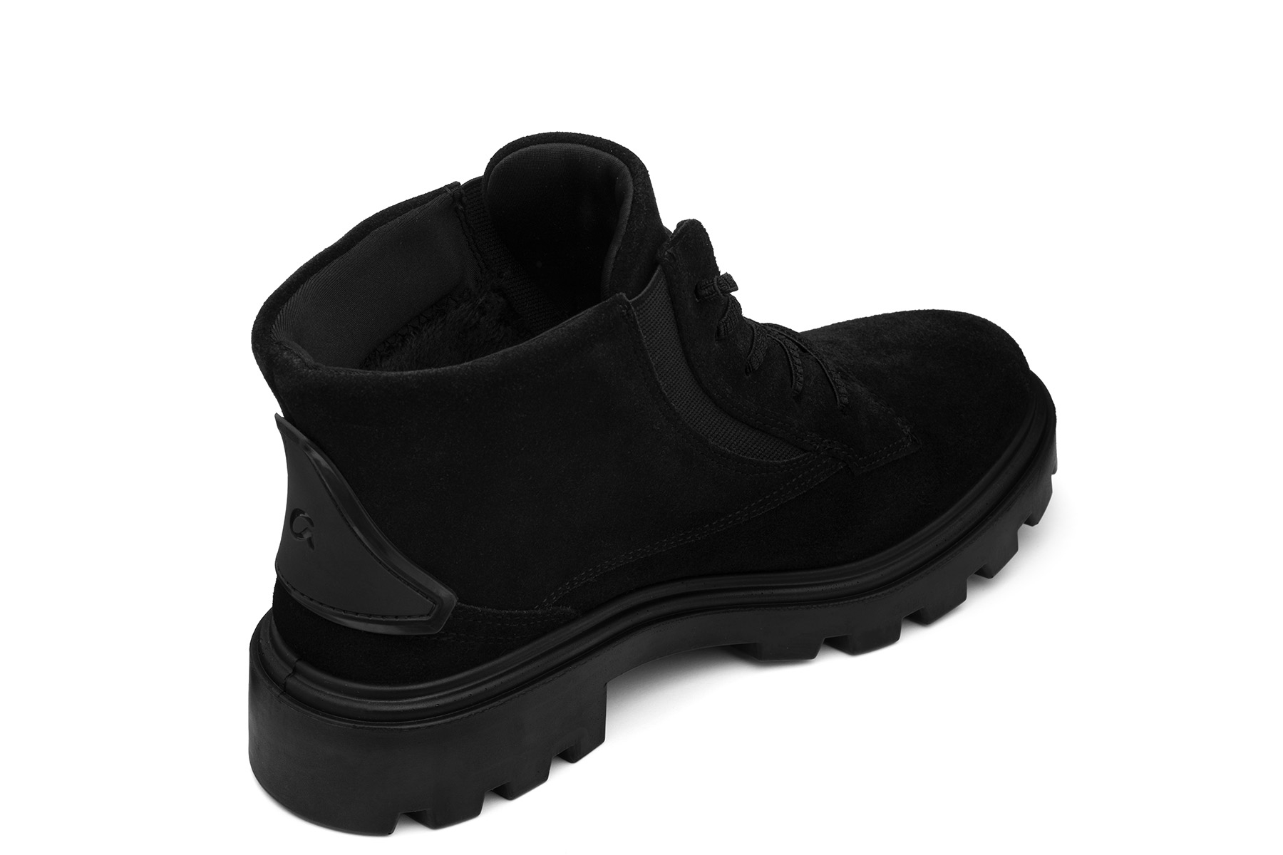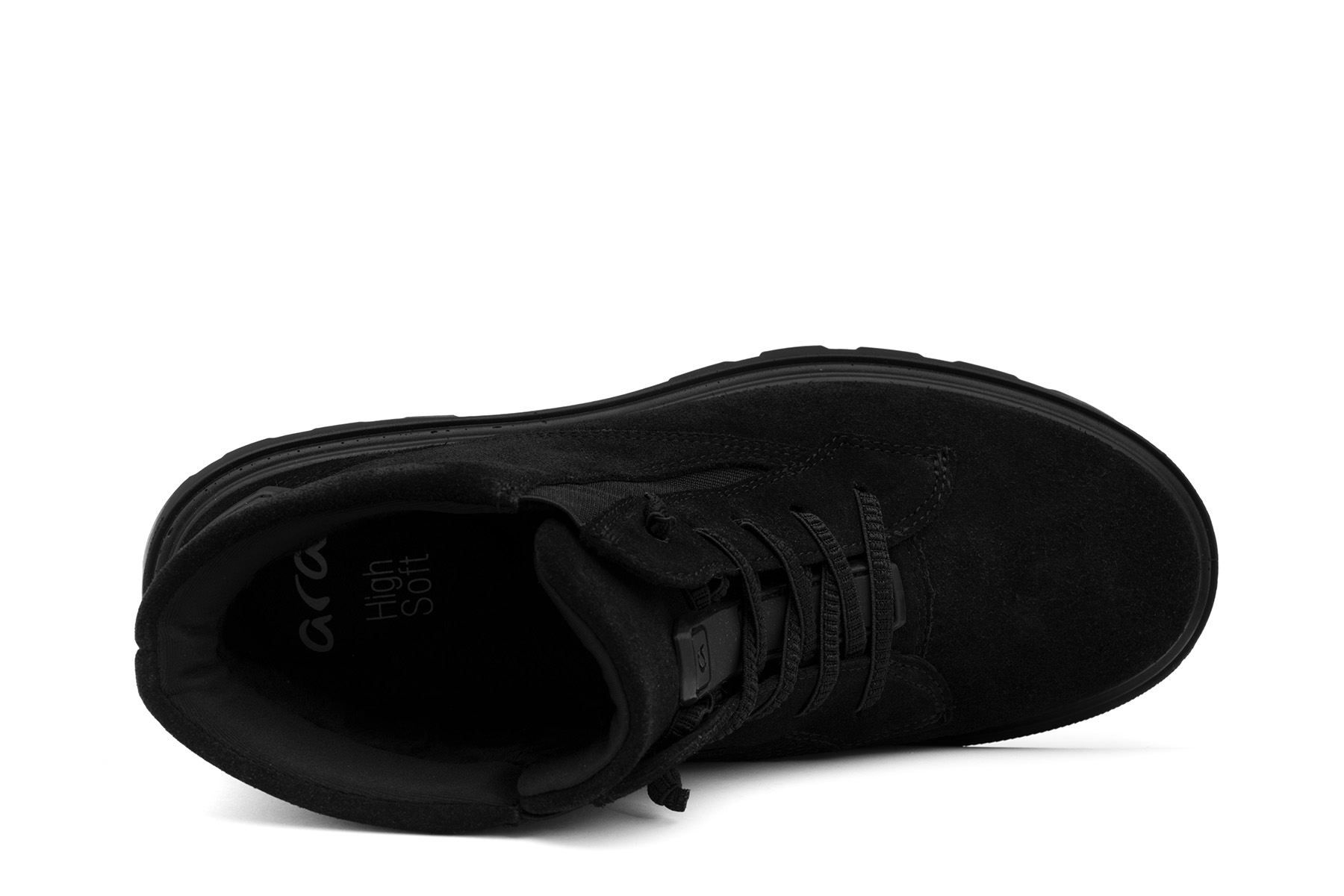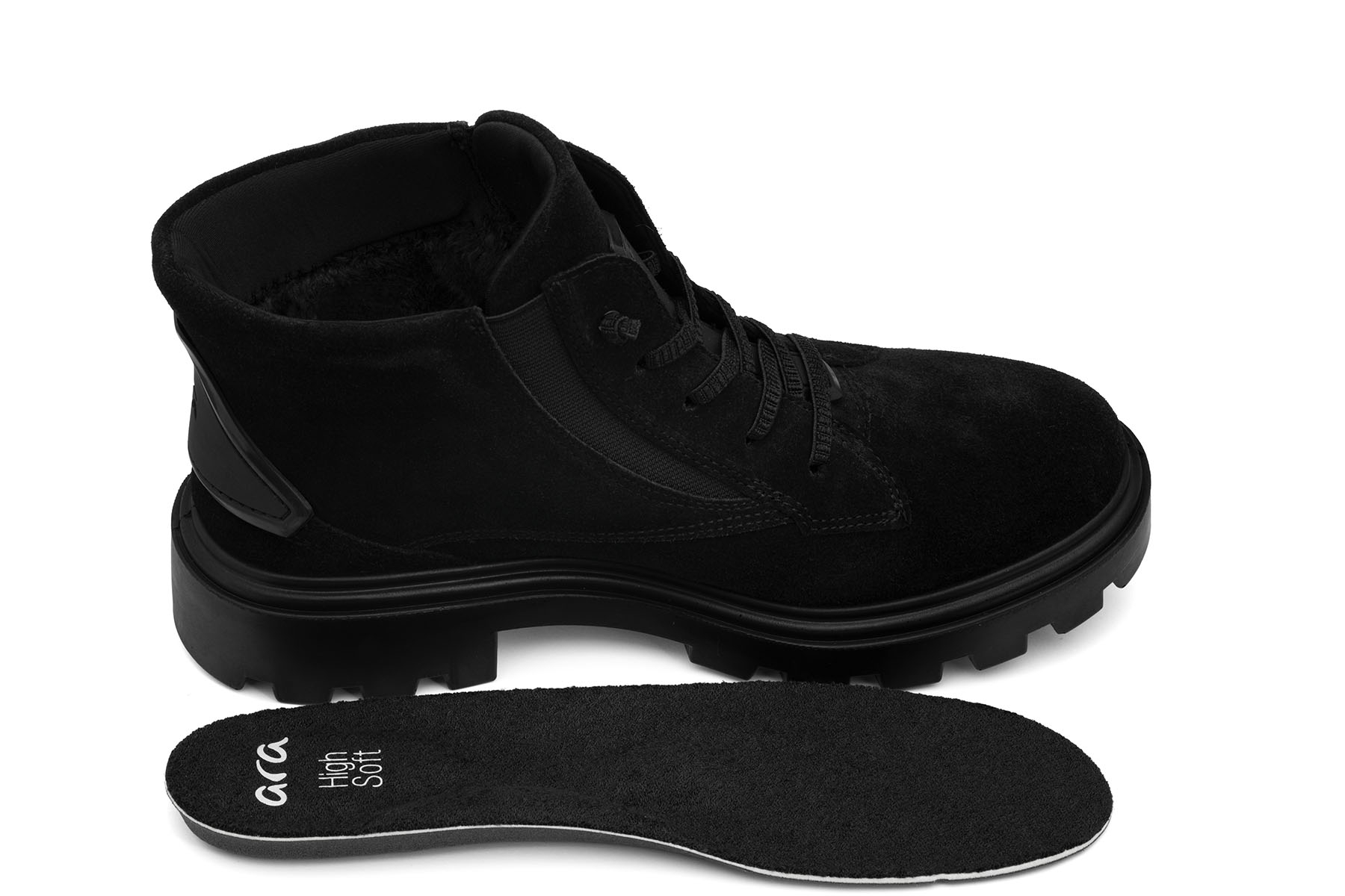 Ara Manchester 12-59118 01H High Soft wygodne botki damskie wykonane z miękkiej skóry naturalnej - zamszowej; wyjmowane, amortyzujące wkładki - HighSoft z pelotą na płaskostopie poprzeczne; grube, elastyczne, antypoślizgowe podeszwy; zapiętki typu Hands Free ; elastyczne sznórówki - nie trzeba ich wiązać; lekko ocieplone futerkiem; tęgość H.
