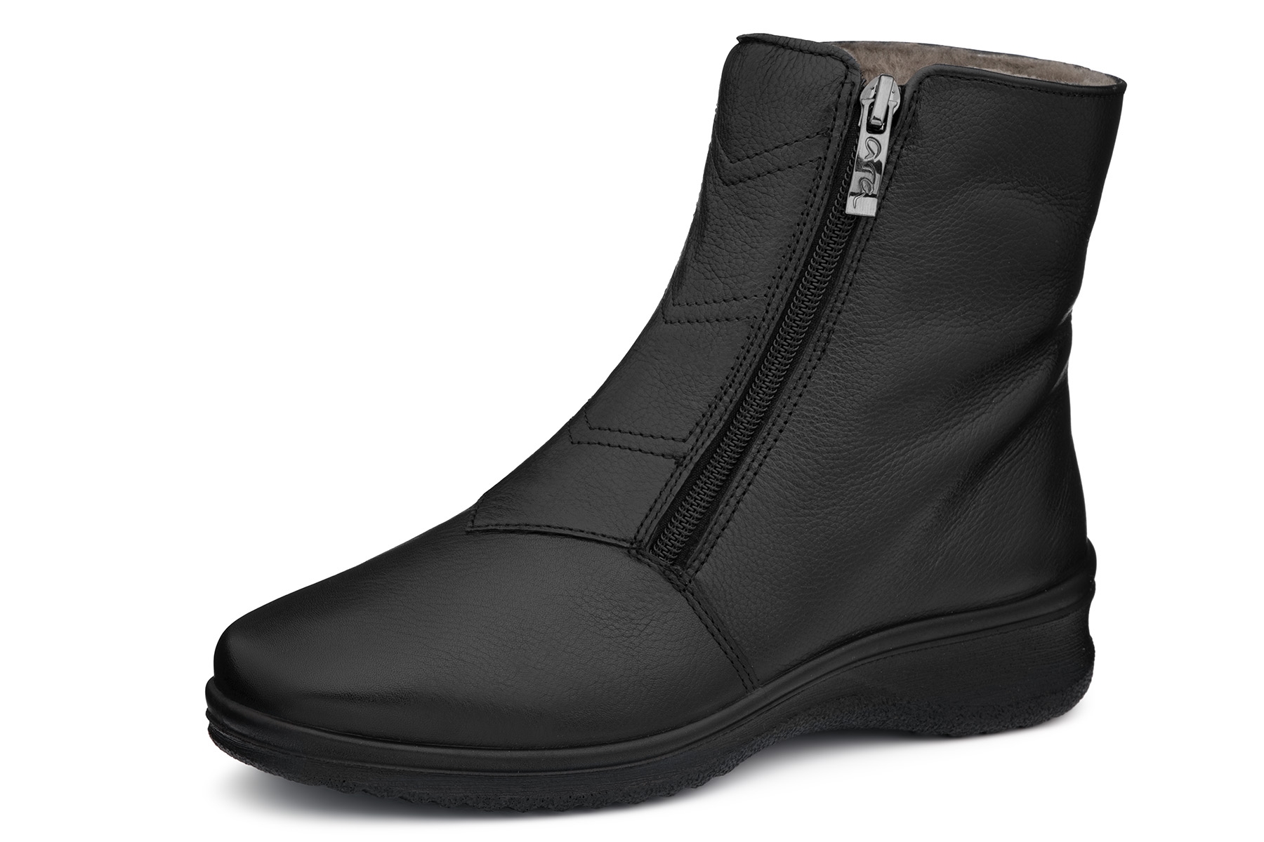 Ara Munchen 12-48539 61H wygodne damskie botki wykonane z połączenia skóry naturalnej - licowej; wyjmowane wełniane wkładki; ocieplone wełna owczą; lekkie, elastyczne, antypoślizgowe podeszwy; boczny suwak ułatwiający zakładanie; tęgość H - polecane na stopy szersze.