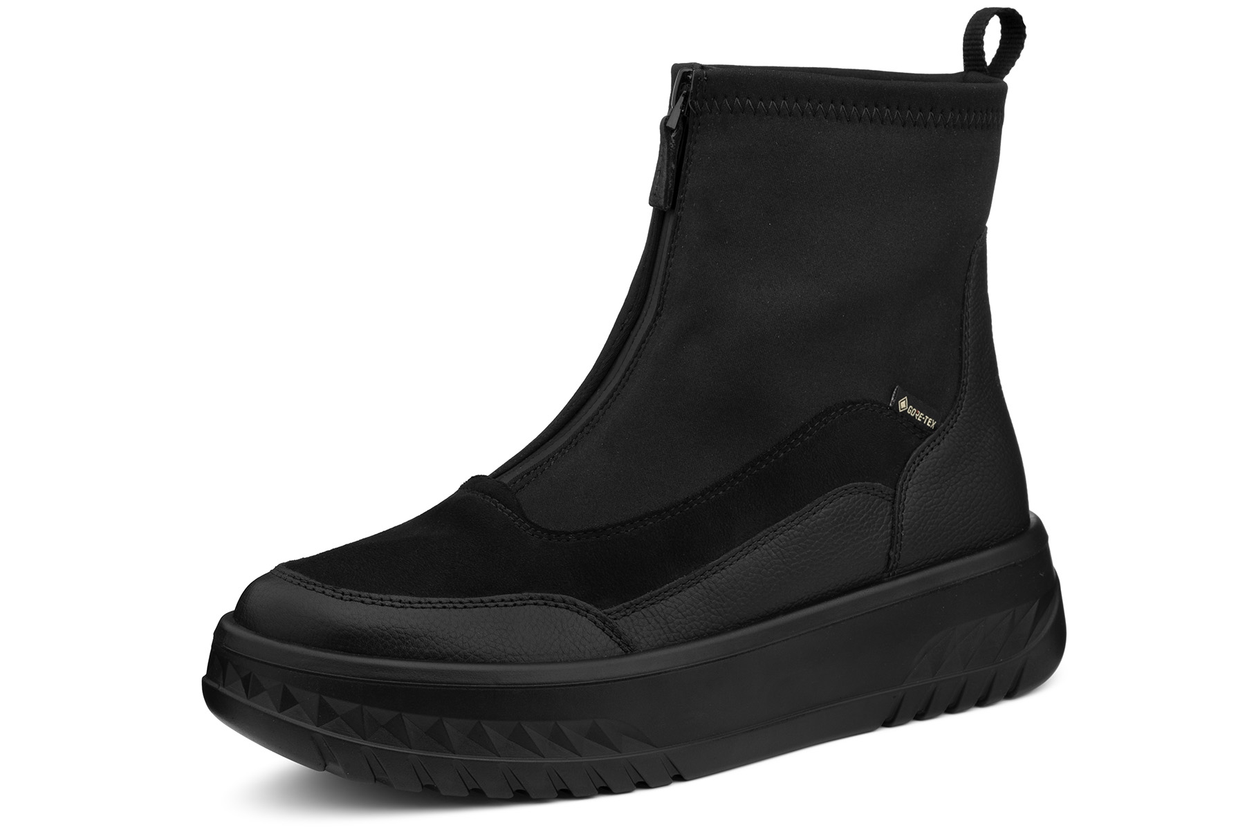 Ara Graz 12-46708 01H High Soft wygodne botki damskie wykonane z połaczenia skóry naturalnej i materiału zabezpieczonego nieprzemakalna membraną Gore-Tex; wyjmowane, amortyzujące wkładki - HighSoft z pelotą na płaskostopie poprzeczne; grube, lekkie, antypoślizgowe podeszwy; suwak ułatwiający zakładanie; tęgość H - polecane na stopy szersze.