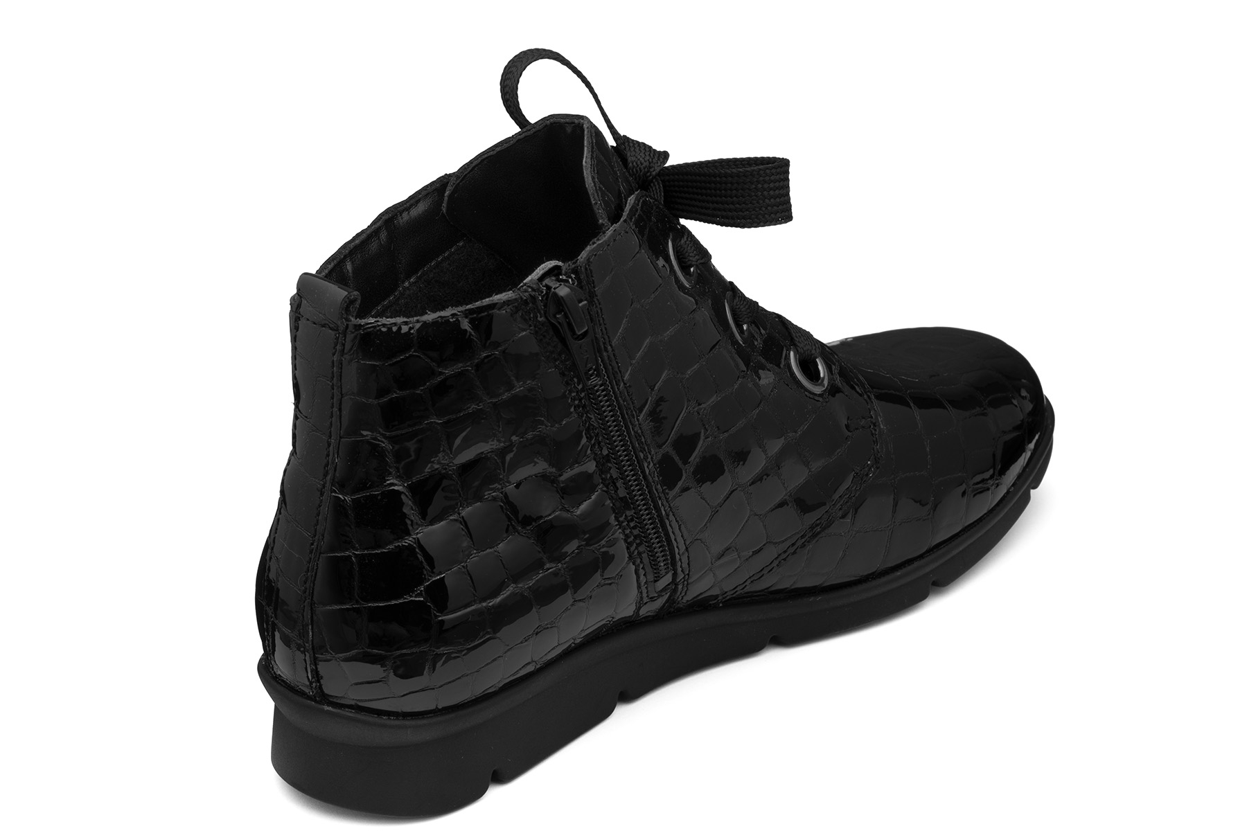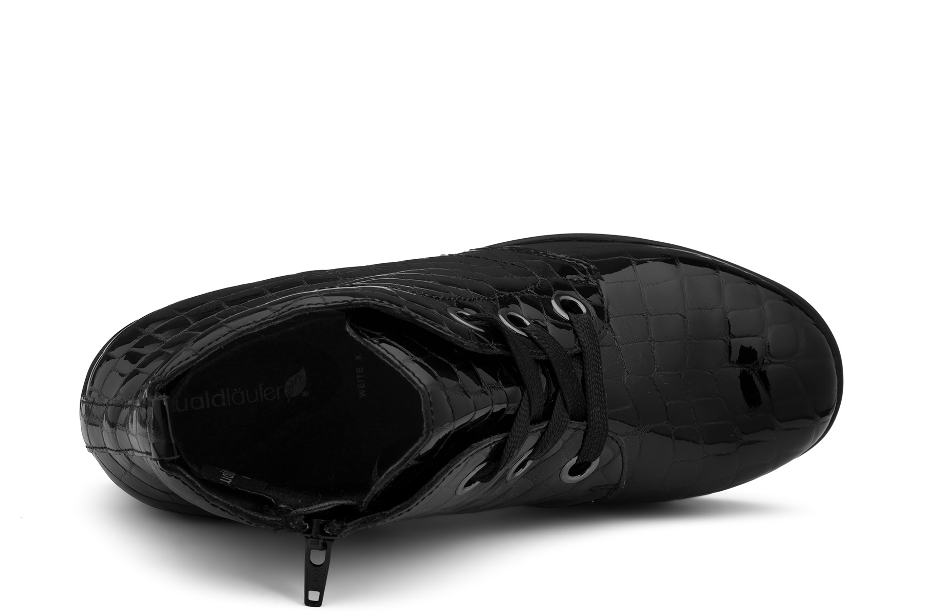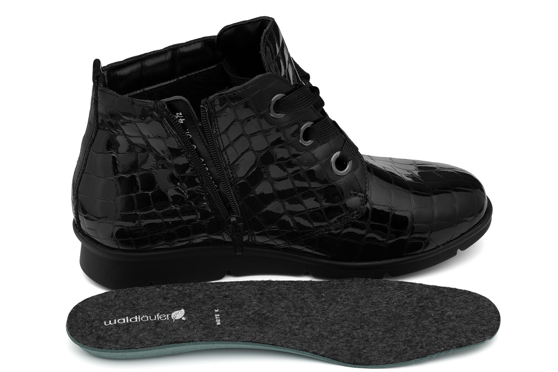 Waldlaufer K-Inga 693801 150 001 wygodne, zdrowotne botki damskie wykonane ze skóry naturalnej - lakierowanej; wyjmowane, filcowe lekko profilowane wkładki; elastyczne, antypoślizgowe podeszwy; boczny suwak ułatwiający zakładanie; lekko ocieplone tkaniną wełnianą; tęgość K - polecane na stopy szerokie.