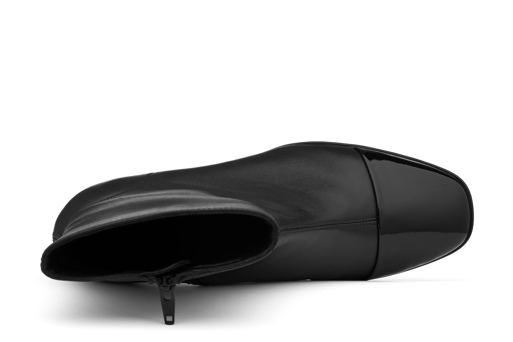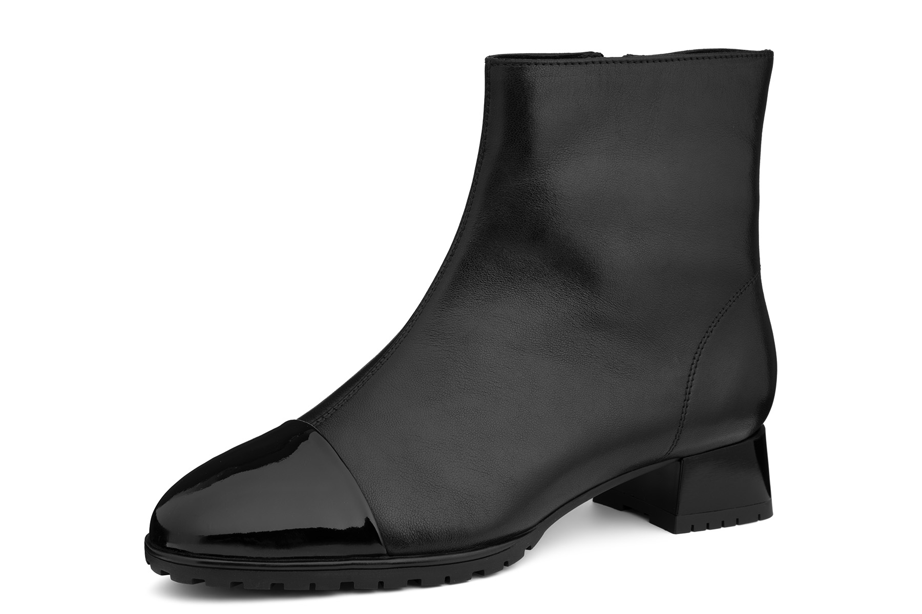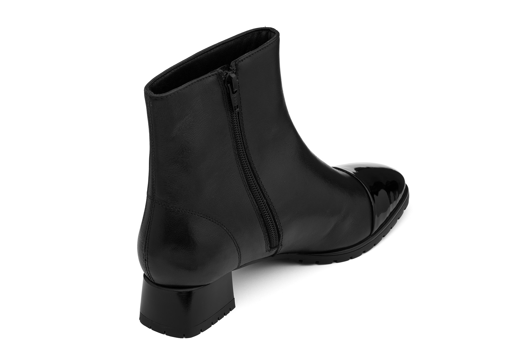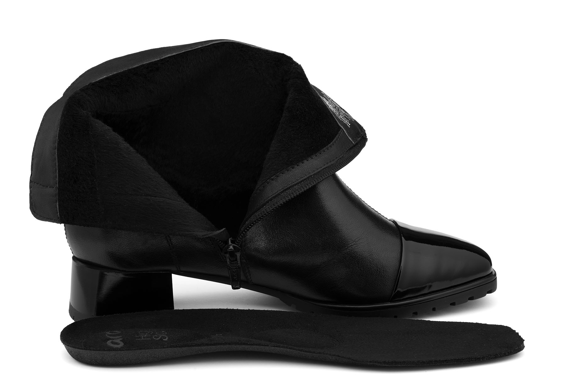 Ara Graz 12 20008 11H High Soft wygodne botki damskie wykonane z miękkiej skóry naturalnej - licowej; nosek - skóra naturalna - lakierowana; wyjmowane, amortyzujące wkładki - HighSoft z pelotą na płaskostopie poprzeczne; lekkie, elastyczne, antypoślizgowe podeszwy; stabilne obcasy; długi boczny suwak ułatwiający zakładanie; lekko ocieplone futerkiem; tęgość H - polecane na stopy szersze.