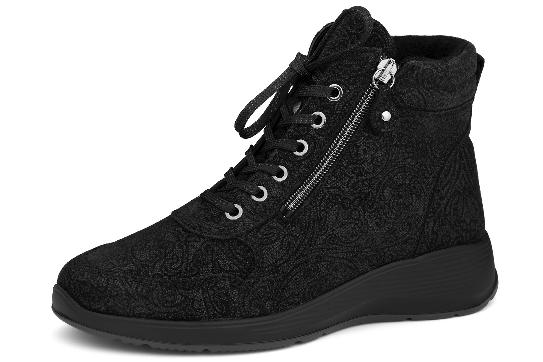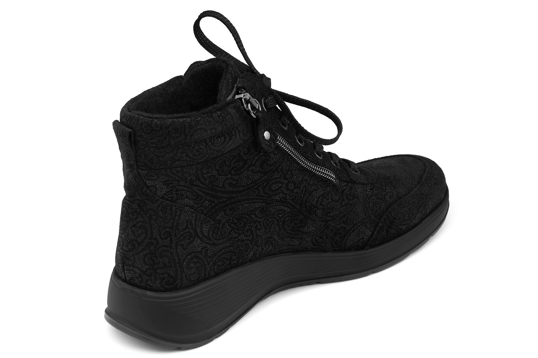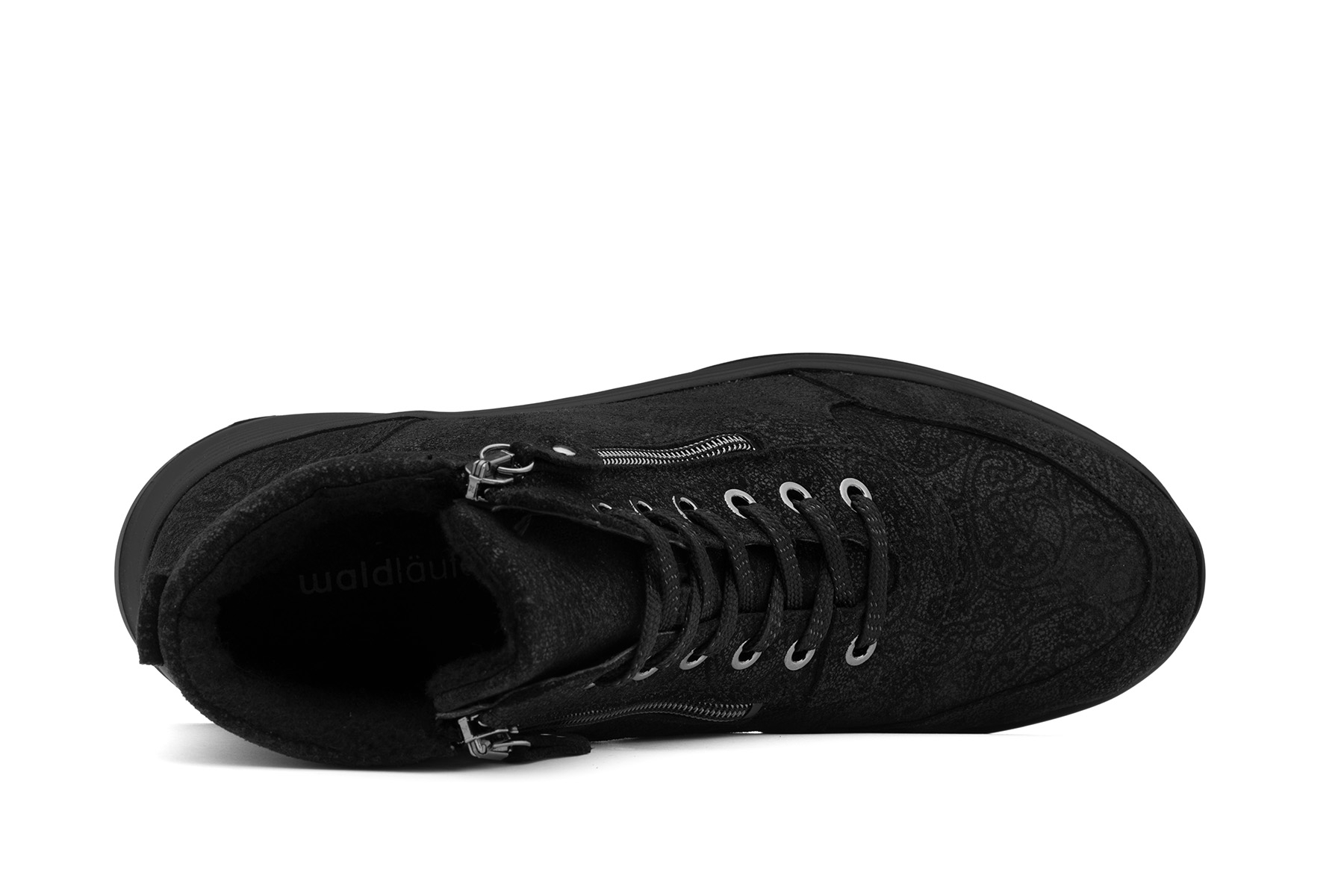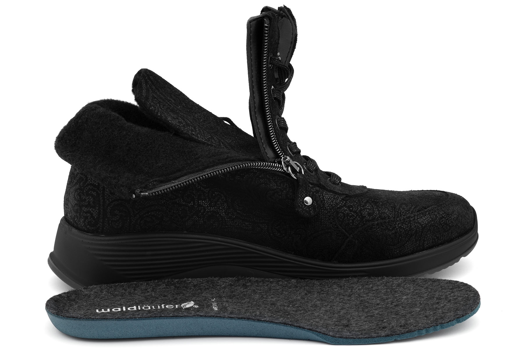 Waldlaufer Kalea 698801 153 001 wygodne, zdrowotne botki damskie wykonane ze skóry naturalnej ; wyjmowane, filcowe lekko profilowane wkładki; elastyczne, antypoślizgowe podeszwy; boczne suwaki ułatwiające zakładanie; lekko ocieplone tkaniną wełnianą; tęgość K - polecane na stopy szerokie.