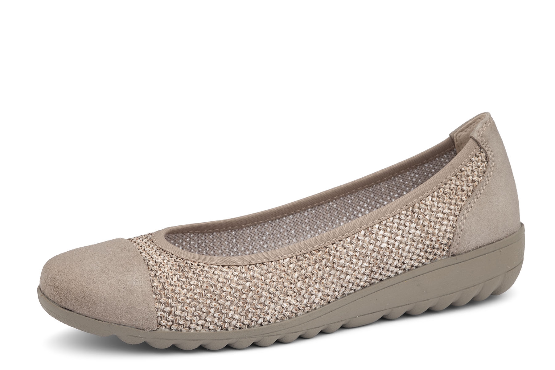 Caprice 9-22123-46 326 wygodne damskie baleriny wykonane z połączenia skóry naturalnej i przewiewnej tkaniny; wyjmowane, silikonowe wkładki pokryte skórą naturalną; elastyczne, antypoślizgowe podeszwy; tęgość G.