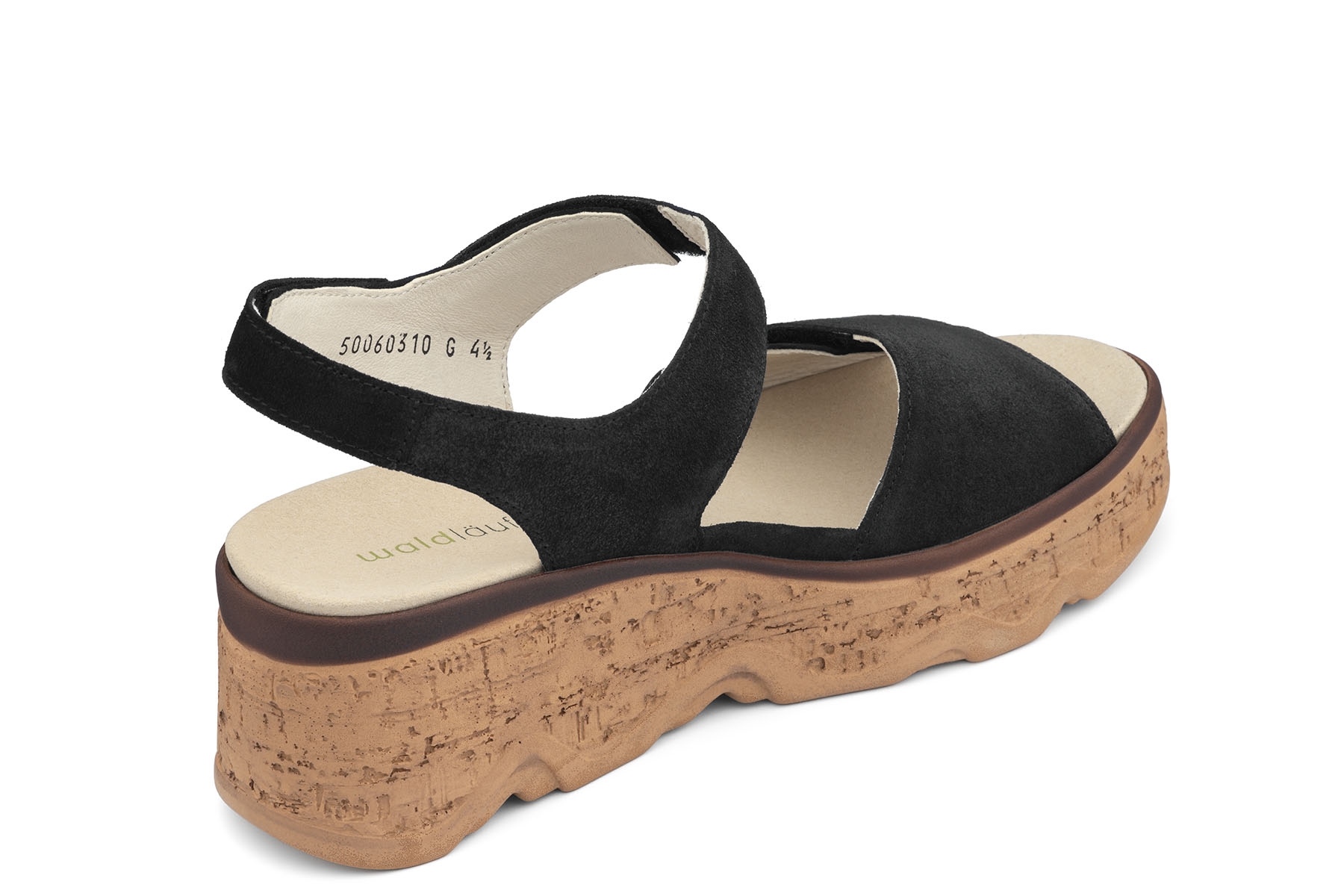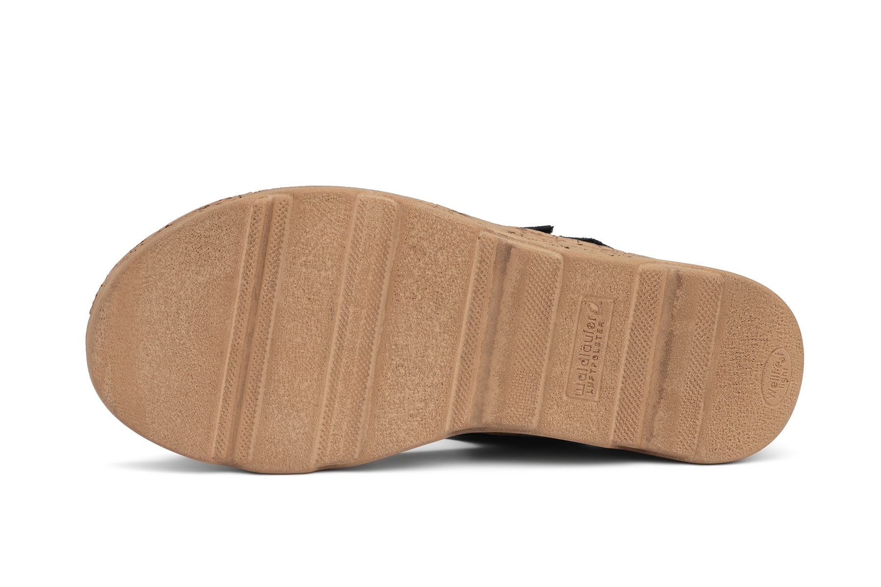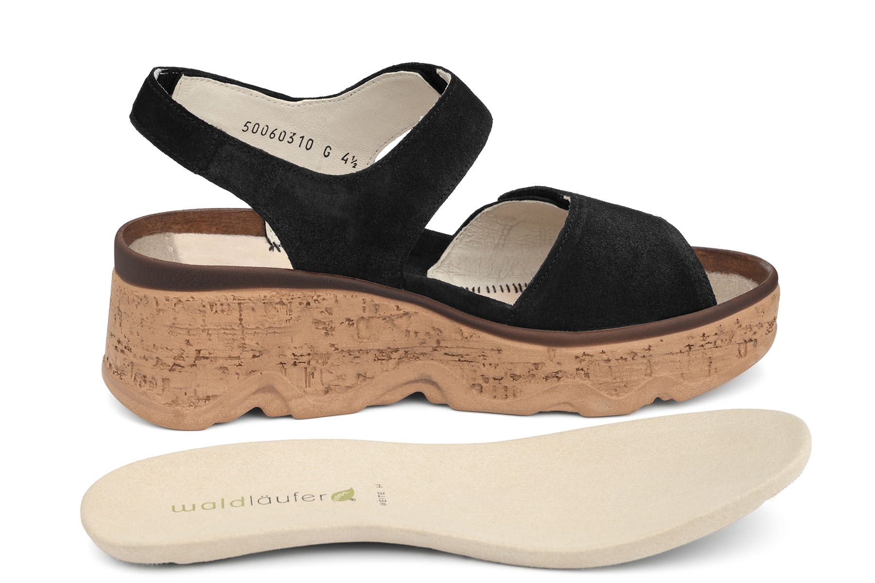 Waldlaufer H-Estela 989001 195 001 wygodne , zdrowotne sandały damskie wykonane ze skóry naturalnej - zamszowej; wyjmowane wkładki profilowane na płaskostopie podłużne i poprzeczne; regulacja paskami na rzep; elastyczne, grube podeszwy; tęgość H - na stopy szersze.
