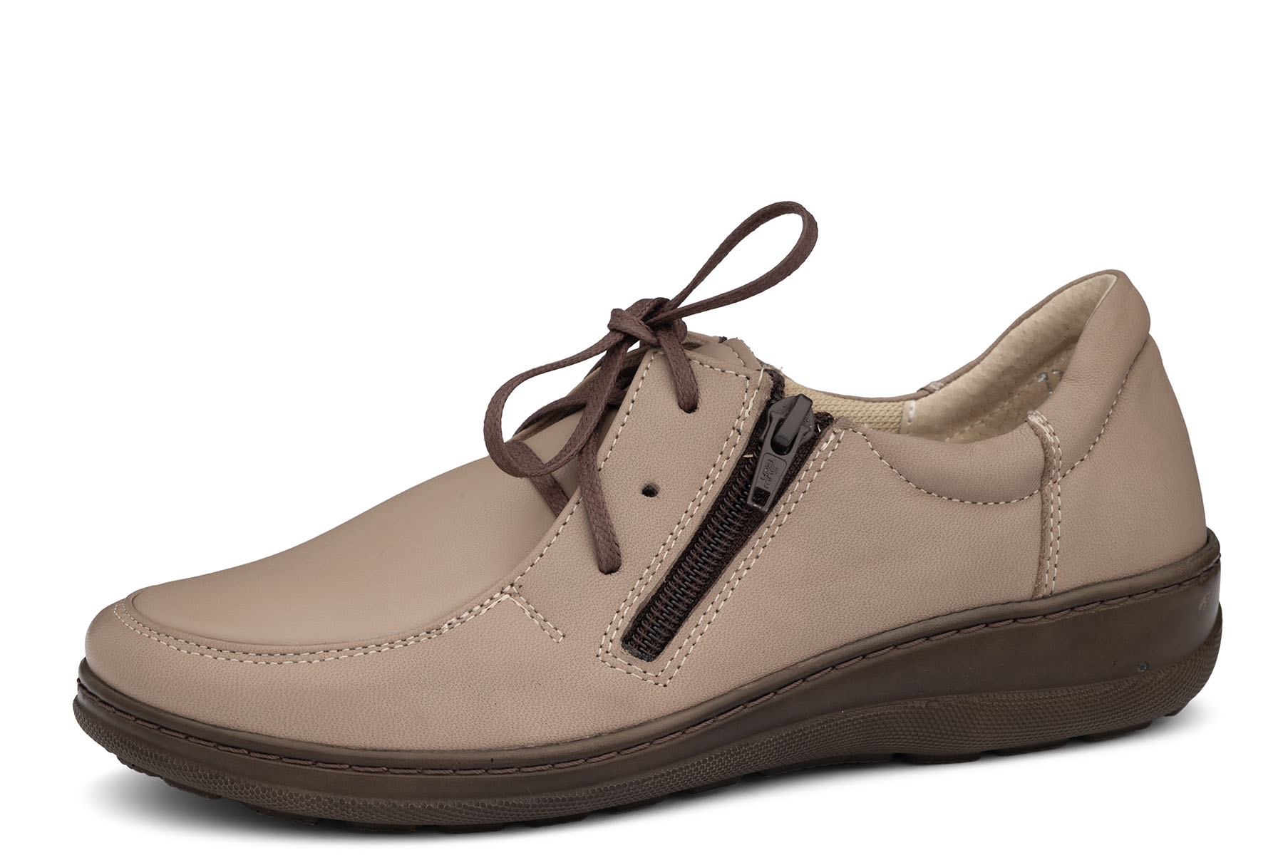 Axel Comfort 1775 to wygodne damskie półbuty wykonane z połączenia miękkiej skóry naturalnej - licowej w kolorze beżowym i elastycznego materiału na podbiciu; wyjmowane, lekko profilowane wkładki; lekkie, elastyczne, antypoślizgowe podeszwy; suwaki ułatwiające zakładanie; tęgość H - polecane na stopy szersze.