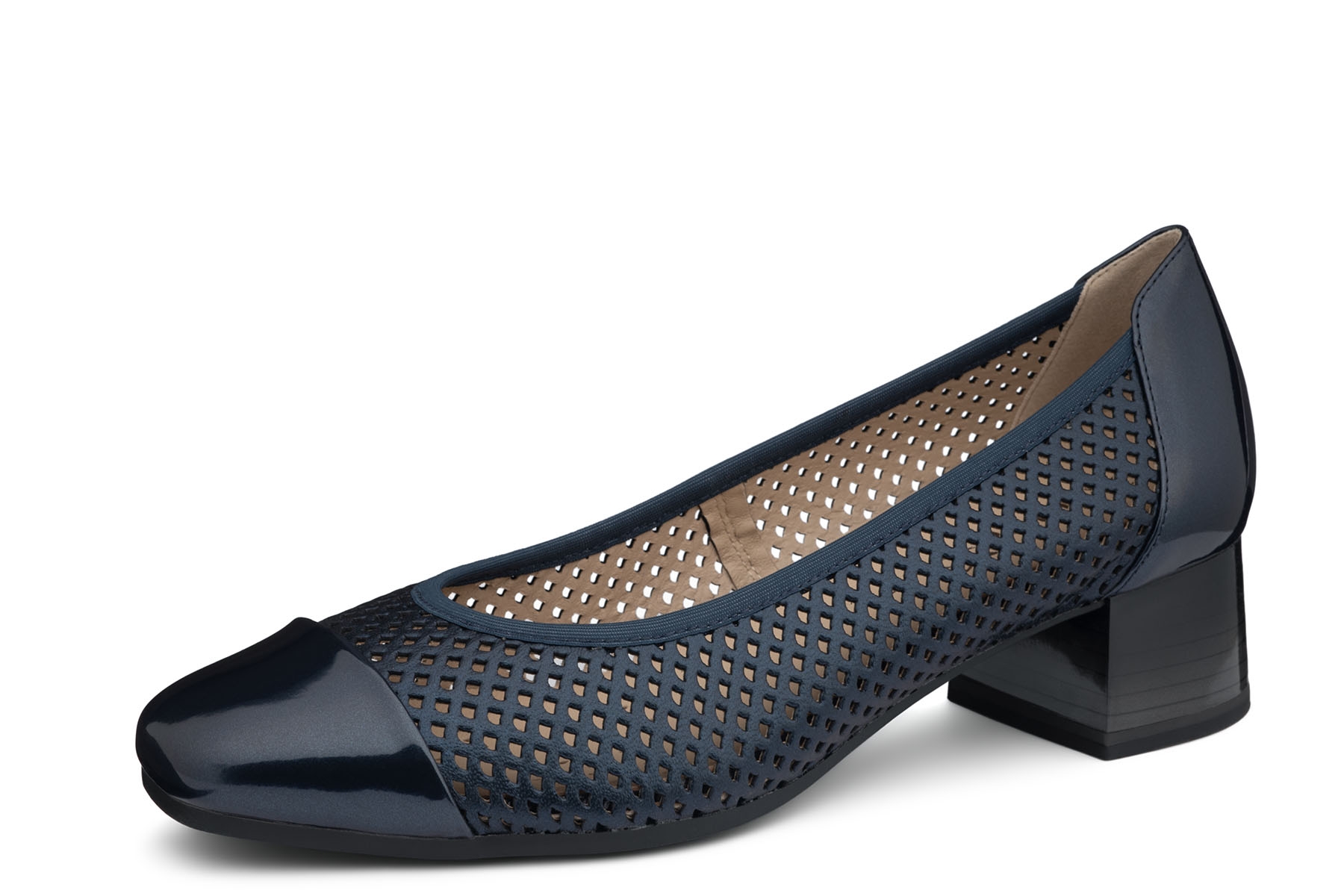 Caprice 9-22304-46 840 wygodne damskie czółenka wykonane z perforowanej skóry naturalnej; wyjmowane, silikonowe wkładki pokryte z wierzchu skórą; elastyczne, antypoślizgowe podeszwy; stabilne obcasy; tęgość H - polecane na stopy szersze.