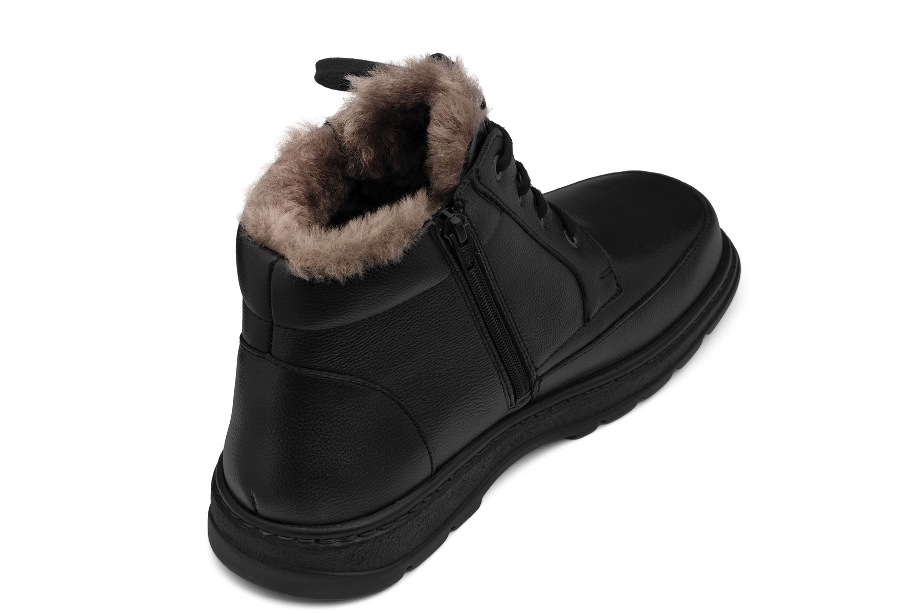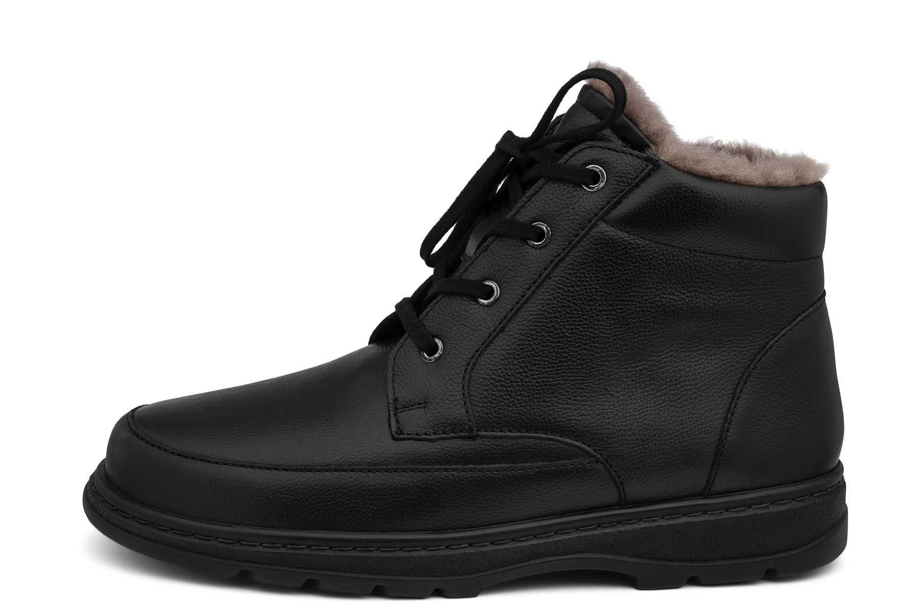 Solidus Natura 82124-00090 wygodne, zdrowotne botki męskie wykonane ze skóry naturalnej; elastyczne, antypoślizgowe podeszwy; wyjmowane, filcowe wkładki profilowane na płaskostopie podłużne i poprzeczne, można je zastąpić własnymi wkładkami ortopedycznymi; mocno ocieplone naturalnym miękkim owczym futrem; umieszczony z boku suwak ułatwia zakładanie obuwia; Tęgość K - na stopy szerokie.