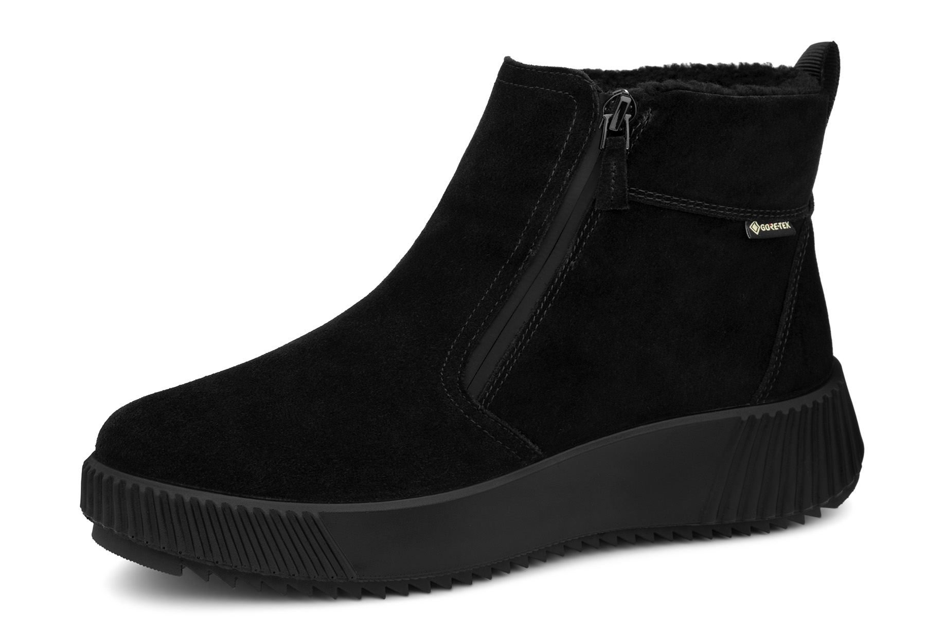 Ara Davos 12-26905 01H High Soft wygodne botki damskie wykonane ze skóry naturalnej - zamszowej zabezpieczonej nieprzemakalną membraną Gore-Tex; wyjmowane, amortyzujące wkładki - HighSoft z pelotą na płaskostopie poprzeczne; grube, antypoślizgowe podeszwy; suwak ułatwiający zakładanie; dobrze ocieplone wełną; tęgość H - polecane na stopy szersze.