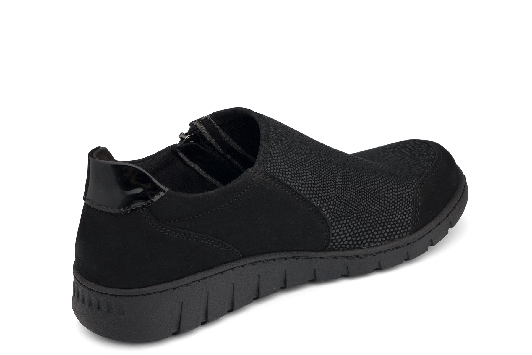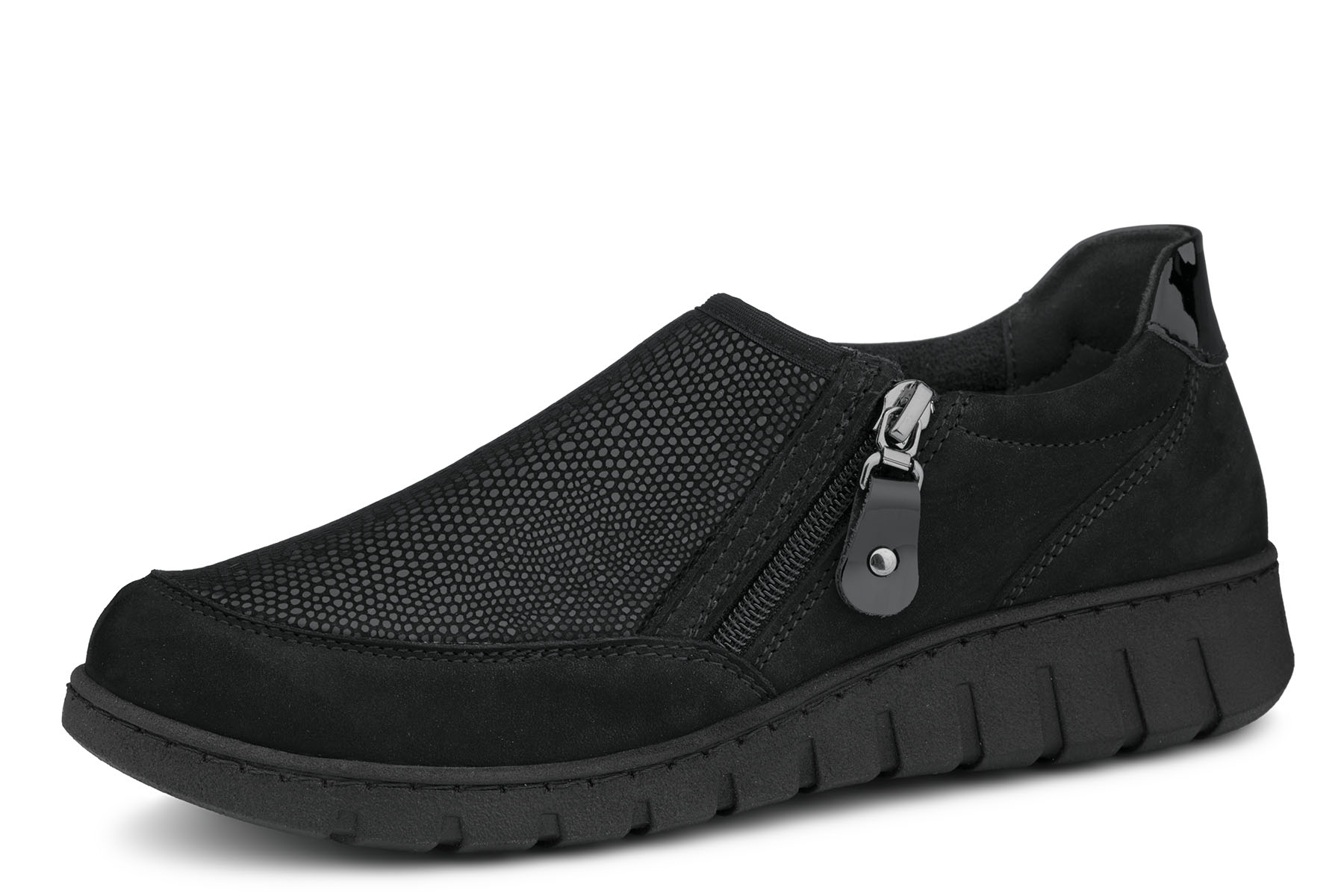 Bailar Amelia wygodne półbuty damskie wykonane z połączenia miękkiej skóry naturalnej - nubuk i elastycznej tkaniny w miejscu haluksów ; profilowane, amortyzujące wkładki z pianki pokryte tkaniną; elastyczne, antypoślizgowe podeszwy; suwak ułatwiający zakładanie; tęgość K - stopy szerokie. Mogą być również na tęgość H dzięki regulacji dodatkowymi wkładkami, które są w zestawie.