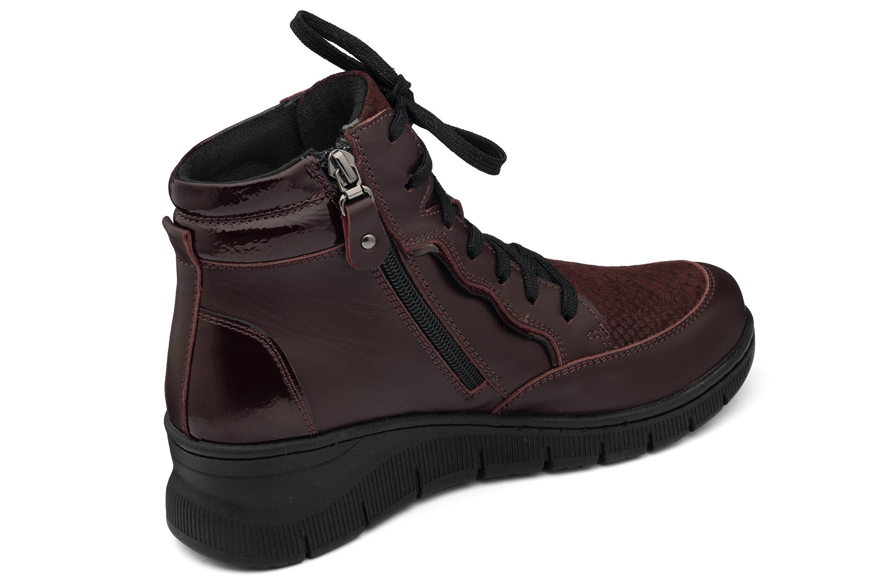 Bailar Maura wygodne botki damskie wykonane ze skóry naturalnej w kolorze bordowym; profilowane, amortyzujące wkładki z pianki pokryte tkaniną; elastyczne, antypoślizgowe podeszwy; boczny suwak ułatwiający zakładanie; tęgość K - stopy szerokie. Mogą być również na tęgość H, dzięki regulacji dodatkowymi wkładkami, które są w zestawie.