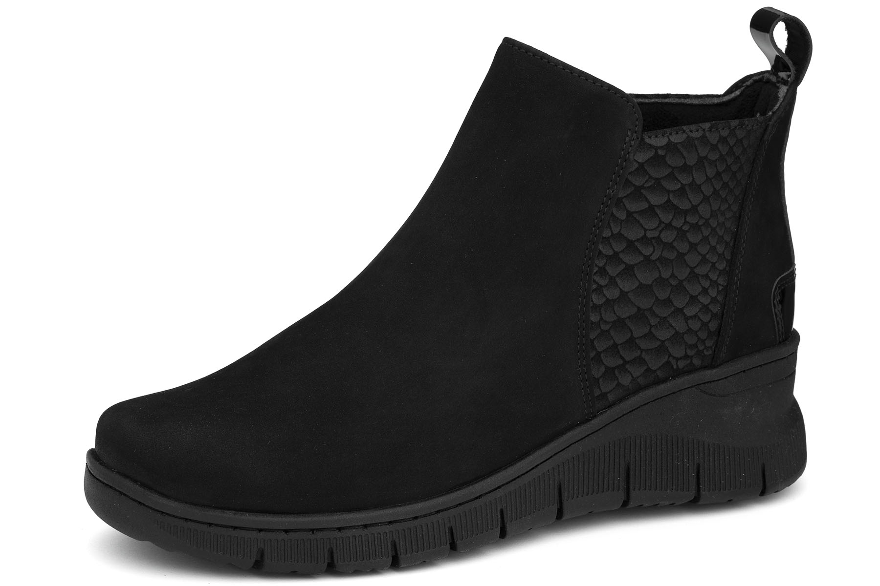 Bailar Camila wygodne botki damskie wykonane ze skóry naturalnej - nubuk w kolorze czarnym ; profilowane, amortyzujące wkładki z pianki pokryte tkaniną; elastyczne, antypoślizgowe podeszwy; boczny suwak ułatwiający zakładanie; tęgość K - stopy szerokie. Mogą być również na tęgość H dzięki regulacji dodatkowymi wkładkami, które są w zestawie.