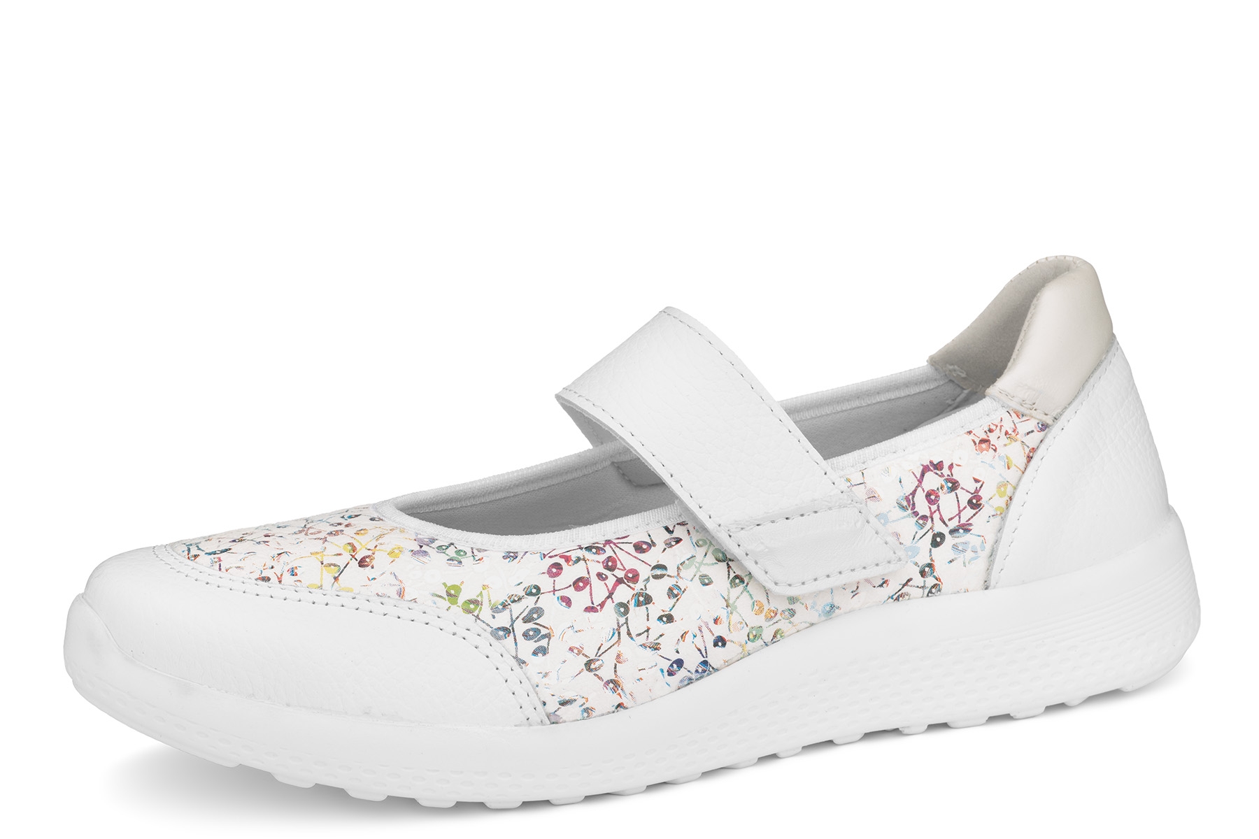 Comfortabel 9405523 03 wygodne damskie baleriny wykonane z połączenia elastycznej tkaniny i skóry naturalnej; wyjmowane, skórzane wkładki - można zastąpić własnymi na przykład ortopedycznymi; lekkie, elastyczne, antypoślizgowe podeszwy; tęgość K - polecane na stopy szerokie, na przykład z haluksami.