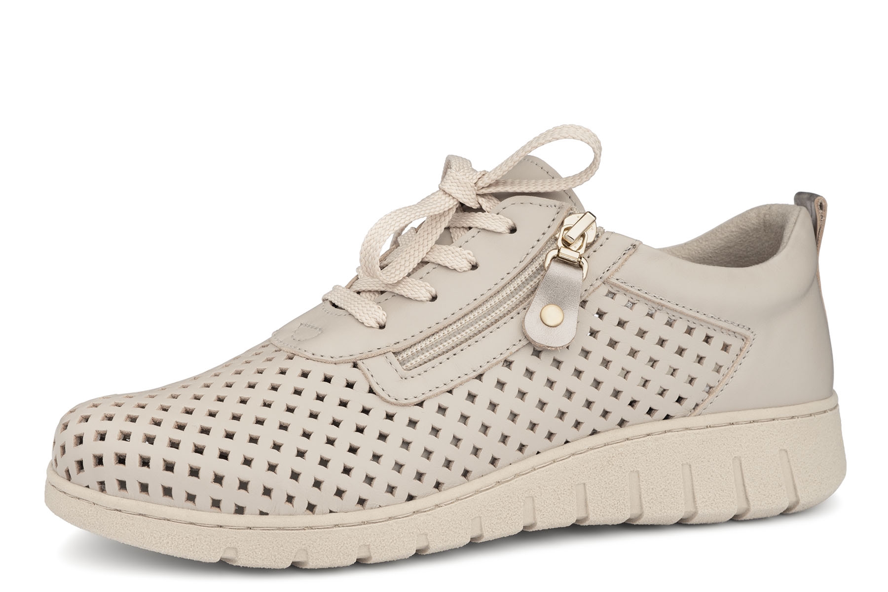 Bailar Rocio wygodne półbuty damskie wykonane z perforowanej skóry naturalnej - licowej w kolorze beżowym ; profilowane, amortyzujące wkładki z pianki pokryte tkaniną; suwak ułatwiający zakładanie; elastyczne, antypoślizgowe podeszwy; tęgość K - stopy szerokie. Mogą być również na tęgość H dzięki regulacji podwójnymi wkładkami, które są w zestawie.