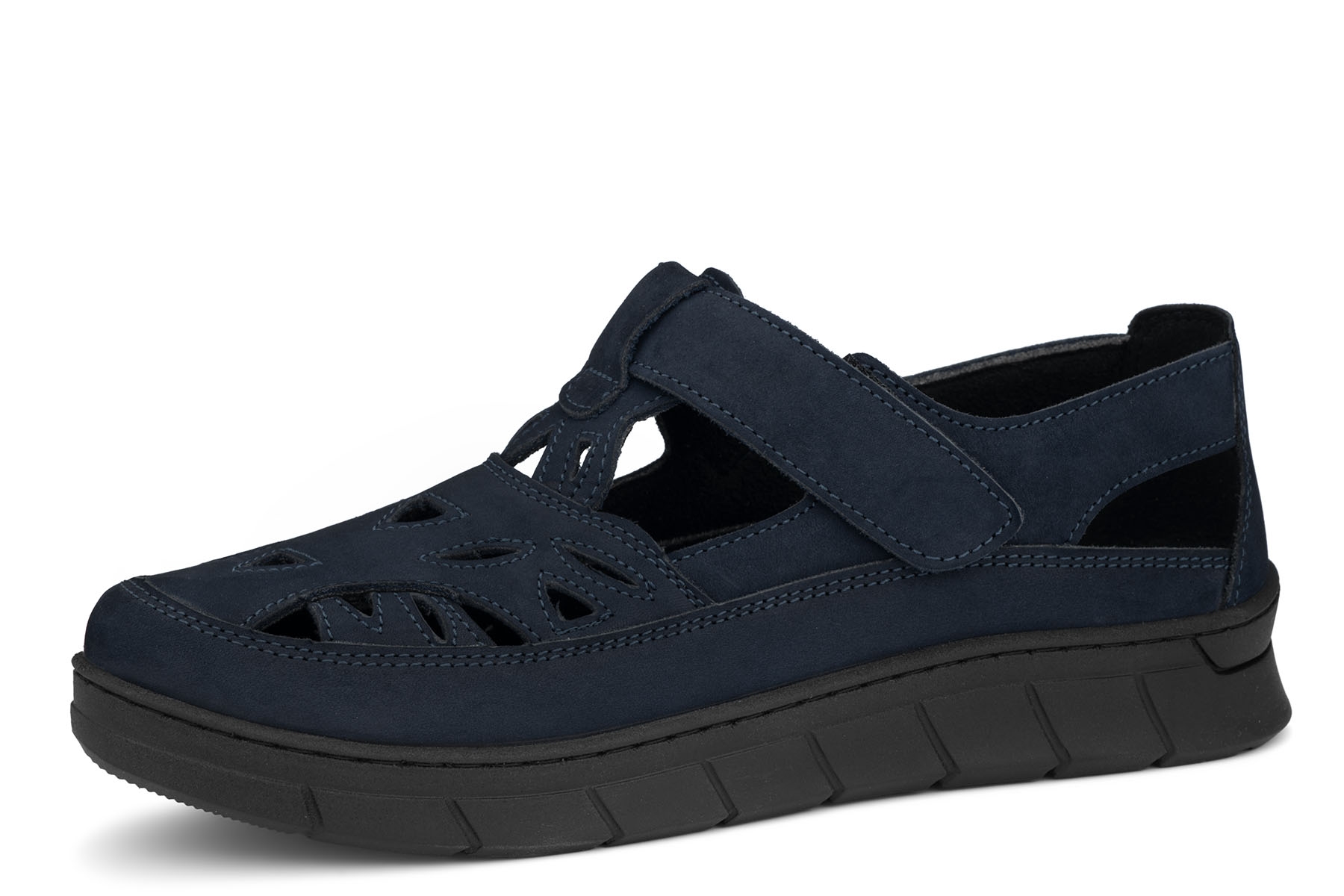 Bailar Alba wygodne półbuty damskie wykonane ze skóry naturalnej - nubuk w kolorze granatowym ; profilowane, amortyzujące wkładki z pianki pokryte tkaniną; elastyczne, antypoślizgowe podeszwy; tęgość K - stopy szerokie. Mogą być również na tęgość H dzięki regulacji podwójnymi wkładkami, które są w zestawie.