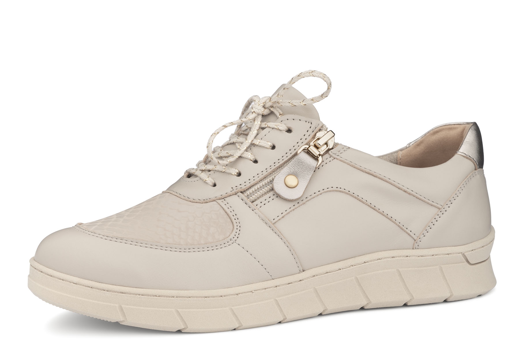 Bailar Paula wygodne półbuty damskie wykonane ze skóry naturalnej - licowej w kolorze beżowym; elastyczny materiał w miejscu haluksów; profilowane, amortyzujące wkładki z pianki pokryte tkaniną; suwak ułatwiający zakładanie; elastyczne, antypoślizgowe podeszwy; tęgość K - stopy szerokie na przykład z halluksami, mogą być również na tęgość H dzięki regulacji podwójnymi wkładkami, które są w zestawie.