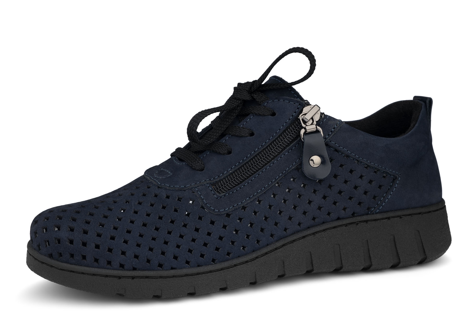 Bailar Rocio wygodne półbuty damskie wykonane z perforowanej skóry naturalnej - nubuk w kolorze granatowym ; profilowane, amortyzujące wkładki z pianki pokryte tkaniną; suwak ułatwiający zakładanie; elastyczne, antypoślizgowe podeszwy; tęgość K - stopy szerokie, mogą być również na tęgość H dzięki regulacji podwójnymi wkładkami, które są w zestawie.