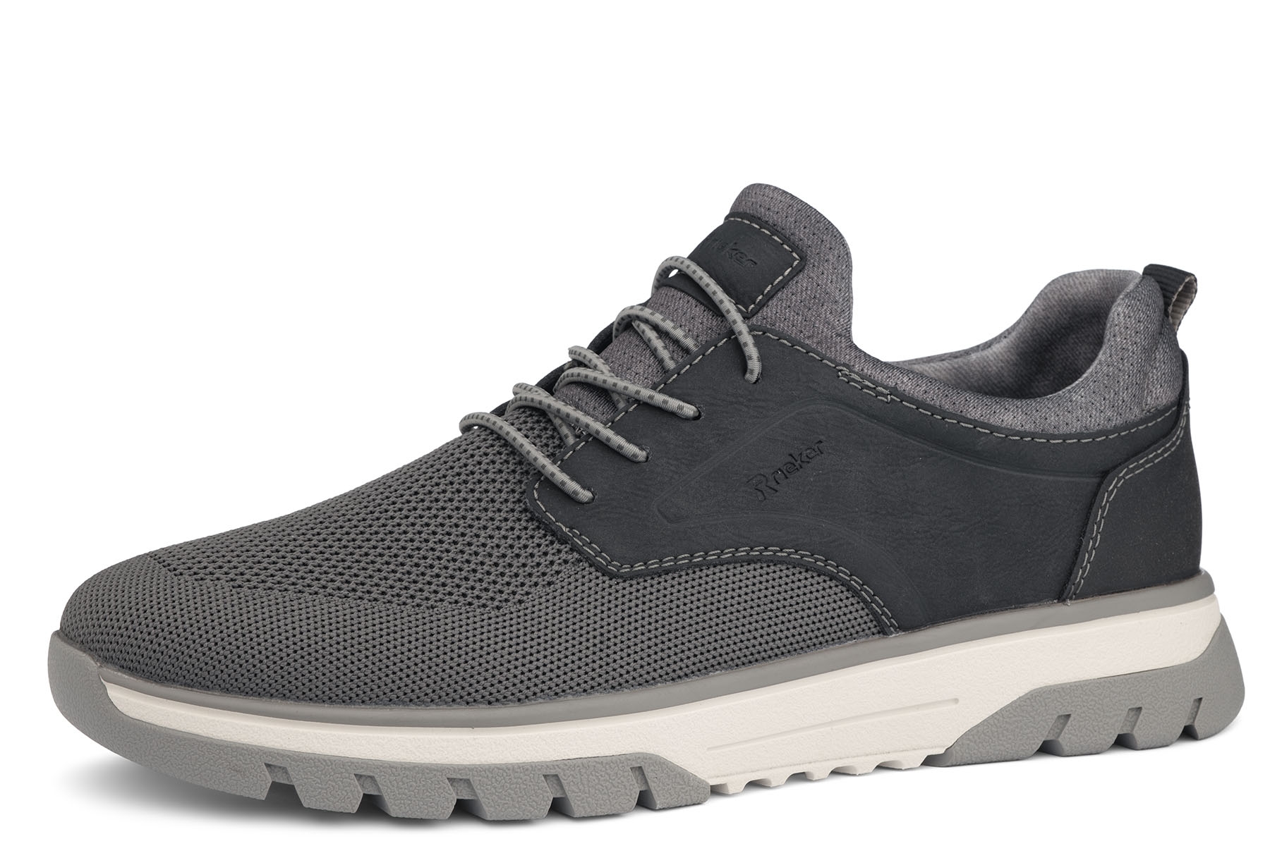 Rieker wzór B9352-00 wygodne półbuty męskie wykonane z połączenia tkaniny i skóry ekologicznej; wyjmowane, miękkie piankowe wkładki pokryte mikrofibrą; lekkie, elastyczne, antypoślizgowe podeszwy; tęgość G - na stopy o normalnej tęgości.