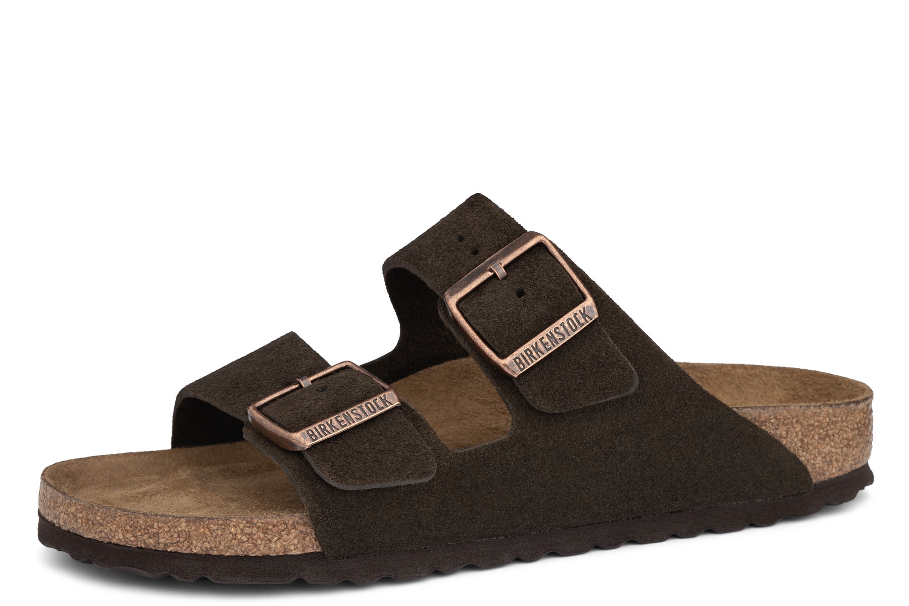 Birkenstock Arizona wzór 0951313 Narrow Fit wygodne, zdrowotne klapki damskie wykonane z miękkiej skóry naturalnej - zamszowej ze skórzanymi wkładkami ortopedycznymi Soft profilowanymi na płaskostopie podłużne i poprzeczne; podpierają stopy w pięciu punktach; zapobiegają powstawaniu haluksów lub hamują ich dalszy rozwój.