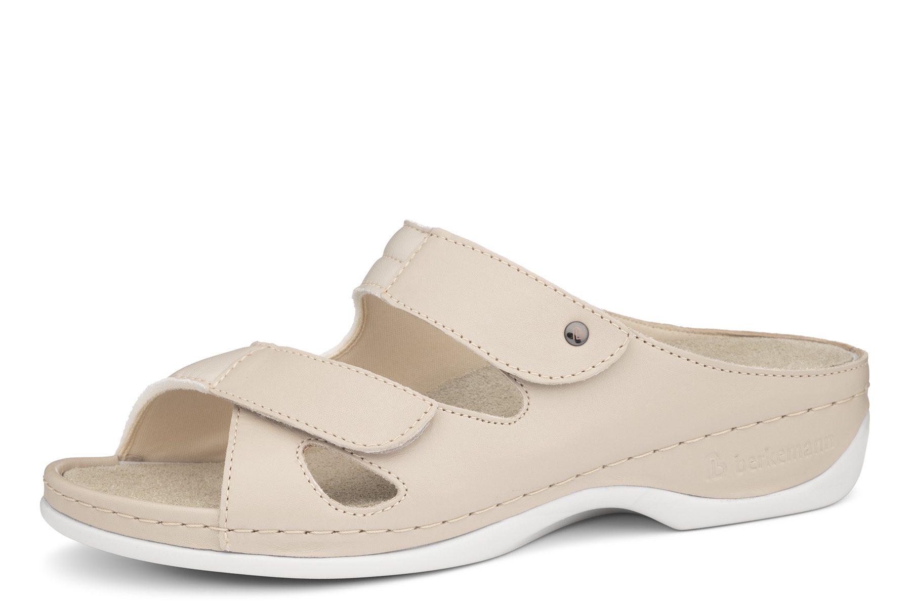 Berkemann Janna wzór 01027 - 720 wygodne, zdrowotne klapki wykonane z wysokiej jakości materiałów; wierzch - miękka skóra naturalna oraz specjalna elastyczna wstawka na haluksy; paski regulowane rzepami; wyjmowane skórzane wkładki ortopedyczne profilowane na płaskostopie podłużne i poprzeczne ( można zastąpić własnymi ); elastyczne, amortyzujące podeszwy; tęgość H - polecane na stopy szerokie oraz dzięki regulacji pasują również na tęgość K - stopy bardzo szerokie.